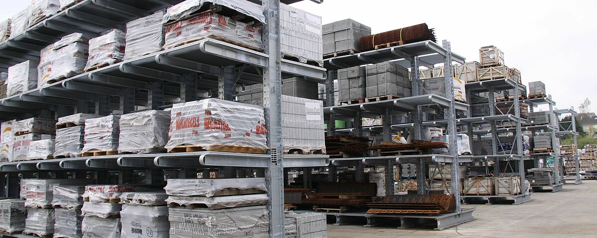 OHRA cantilever racking is made of hot-rolled steel profiles and is very robust – even with increasing load requirements. With standard arm loads of up to 2,500kg and support loads of up to 10,000kg, our cantilever racking can handle heavy loads with ease. Whether pipes, sheet metal, bricks, wooden packages, coils, or pallets for heavy long goods – our cantilever racking is suitable for a wide range of heavy goods. At the same time, the high quality guarantees safe storage both indoors and outdoors.