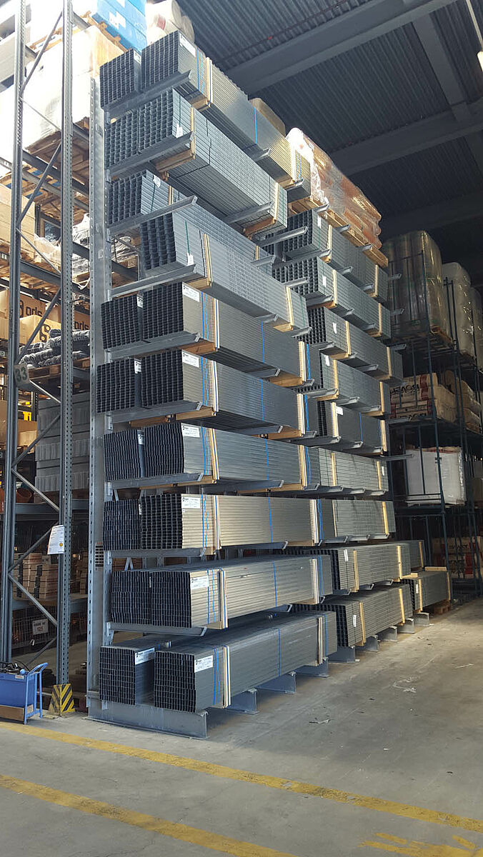 - Rack columns and cantilever arms made of solid, hot-rolled IPE steel for bearing heavy loads