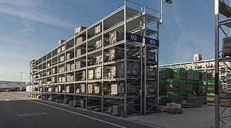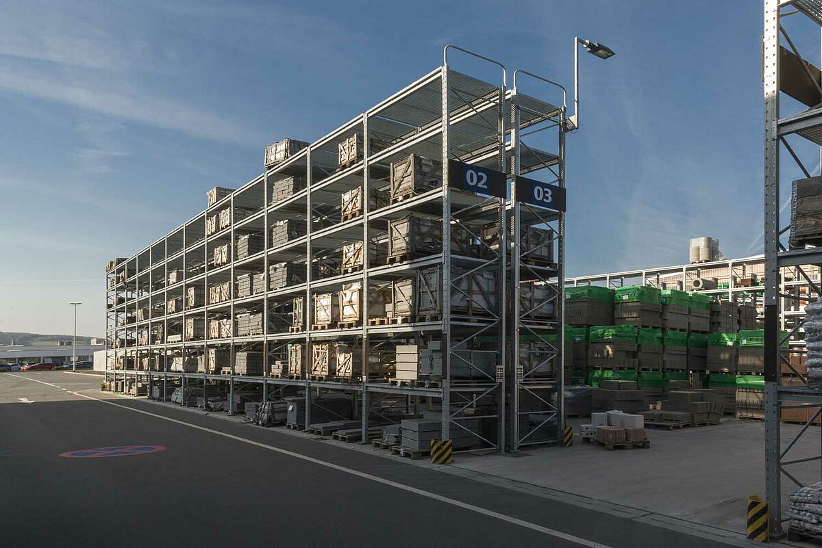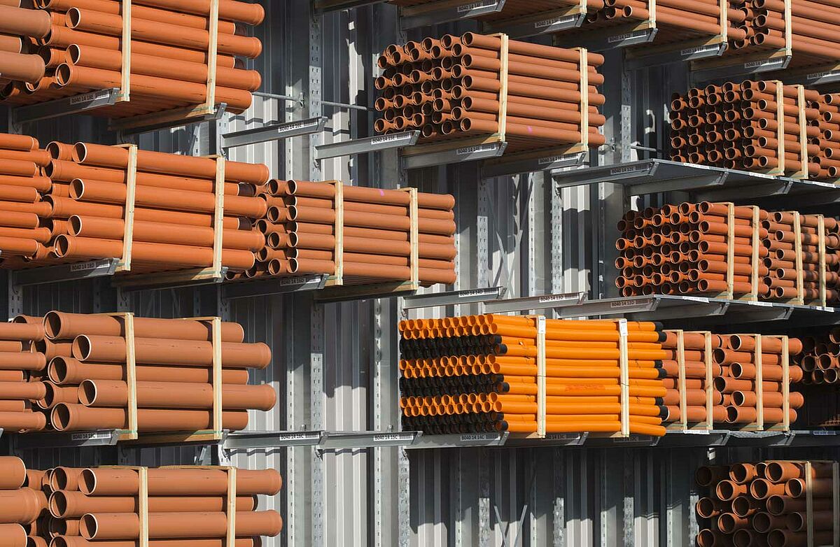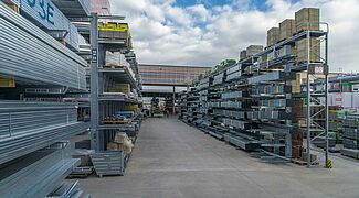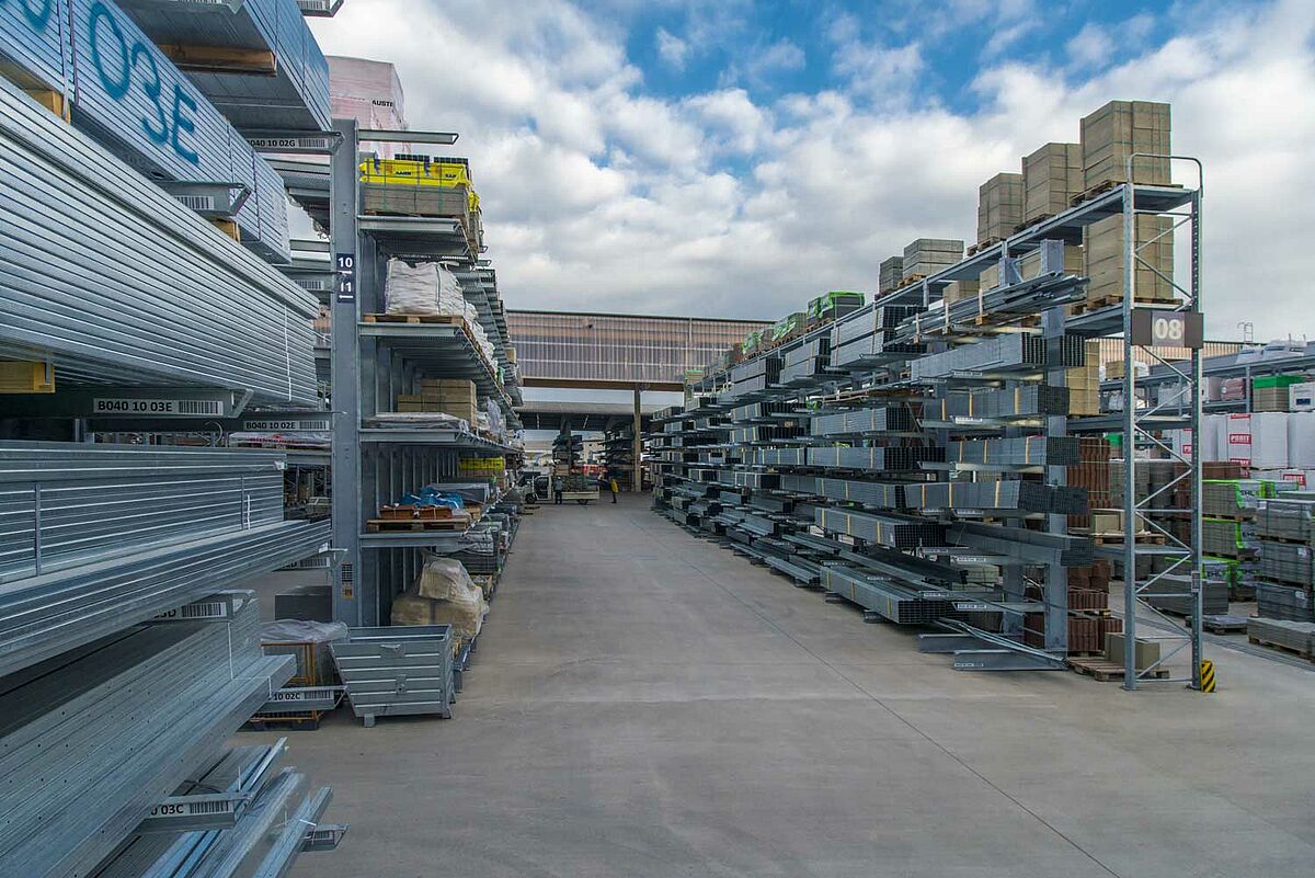 In total, 440m of cantilever racks and 970m of pallet racks with a total storage area of 13,400sqm were erected on this site. The average storage height was 7m and the racks were, apart from specific accessories for the construction materials trade, also partly constructed with roofs.