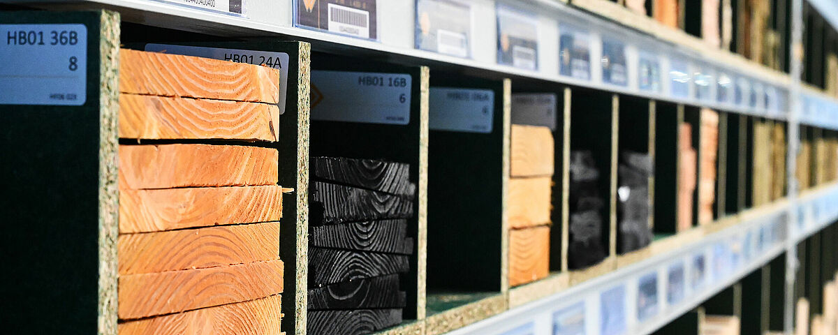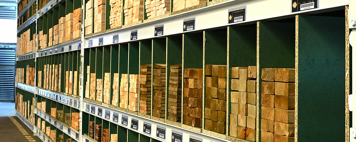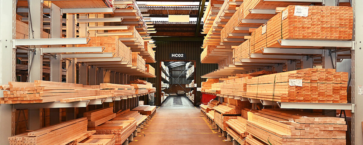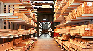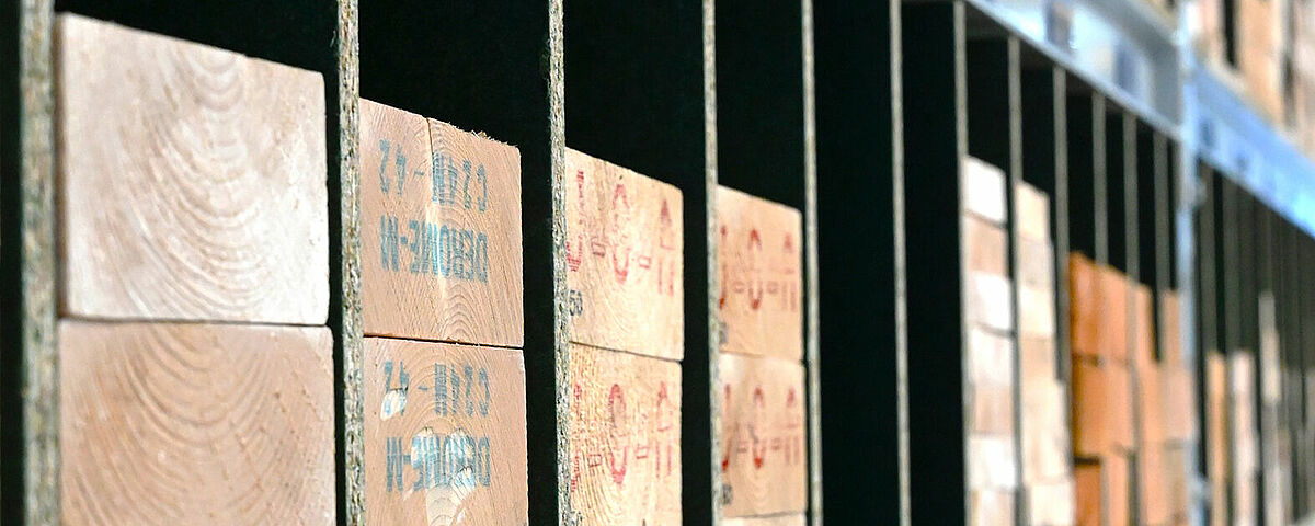 To obtain a continuous storage area, OHRA installed chipboard as floors in the storage levels. They are divided by 18mm chipboard that Brentjens installed themself. This creates compartments of different widths into which strips, and slats can simply be pushed lengthways. Each compartment is filled with just one type of article - so the customer can see the different cross-sections directly and can quickly access the desired goods. The top of the rack is also used “classically” as a pallet rack and offers additional storage space for a wide variety of materials.
