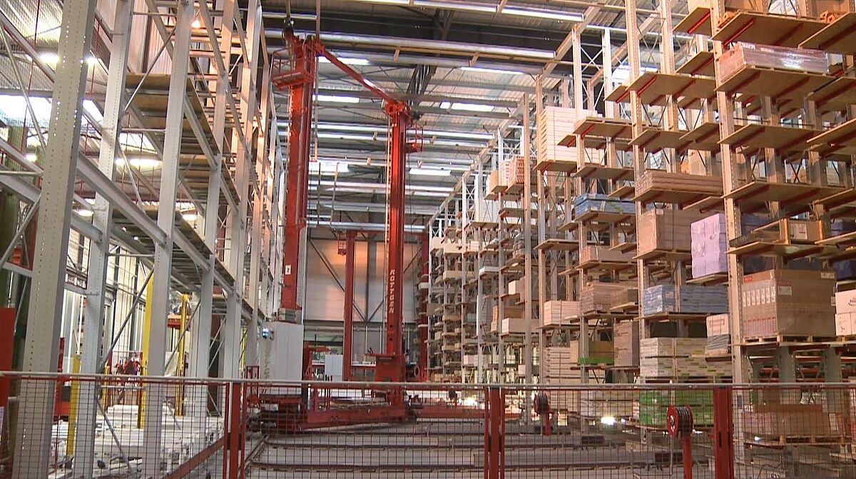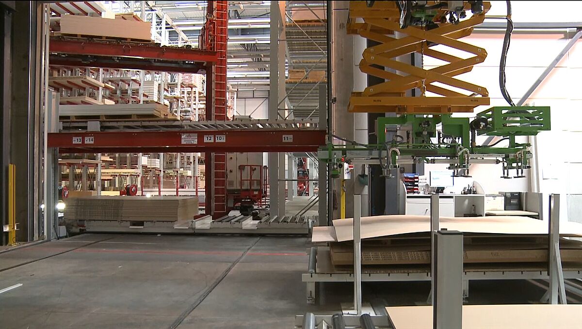 In zone 1 a fully automatic stacker crane is responsible for the storage and retrieval of the chipboard packages and palleted laminate floorboards weighing up to 5 tons and with a length of up to 5.1 meters. The curve-traversing stacker crane services all three aisles in this section of the warehouse. The goods are either removed from storage for customer orders or for production orders from the cooperatives-own pre-cut goods. Chain and roller conveyors receive the goods from the stacker crane and transport them to the corresponding work stations.