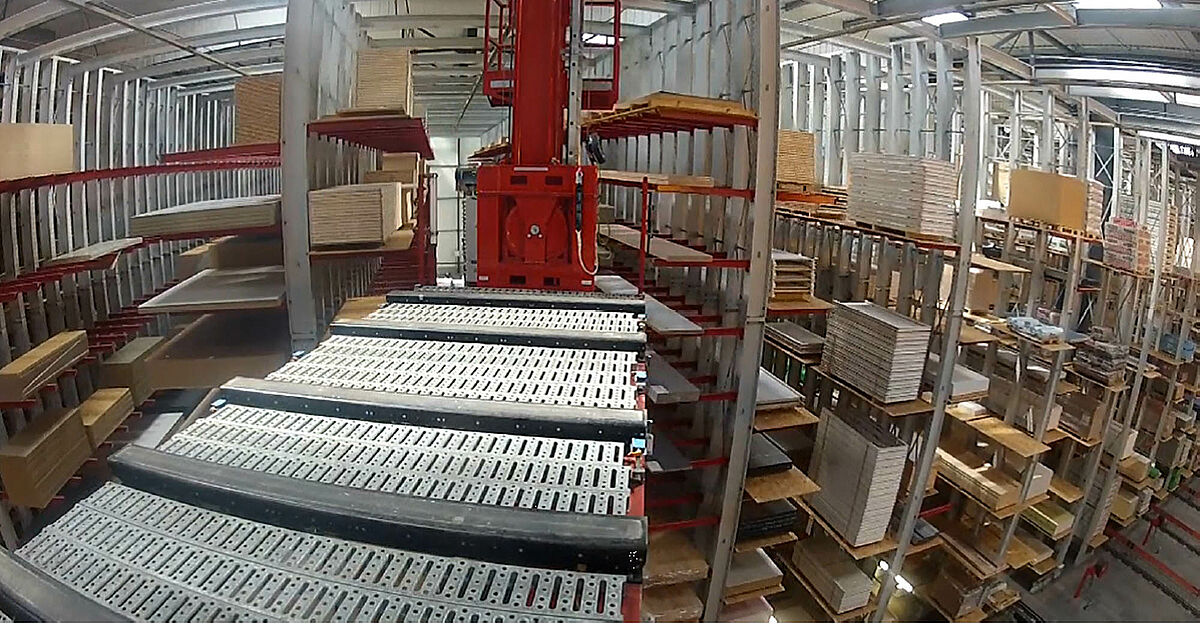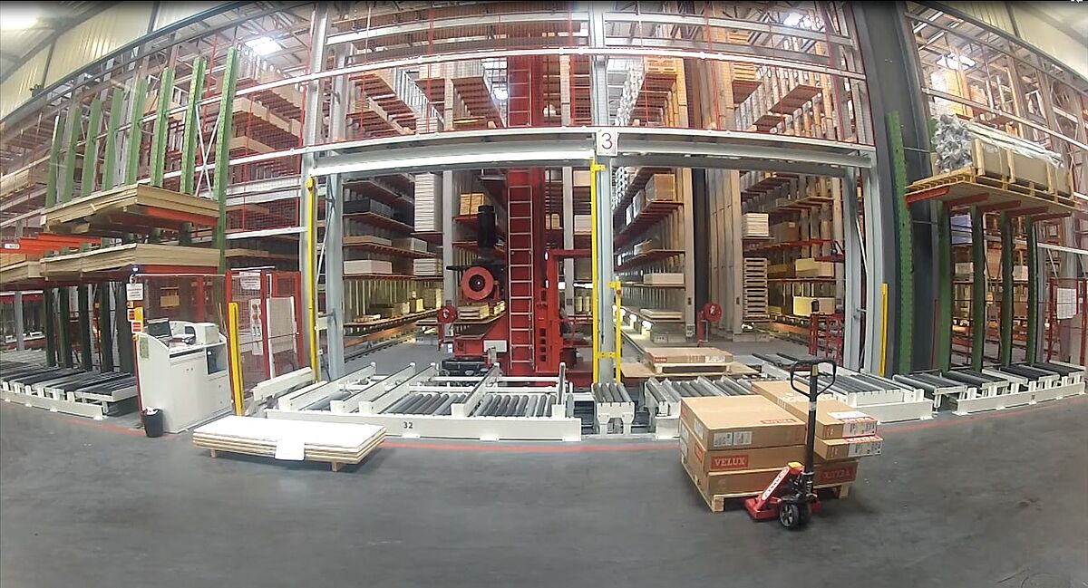 The project team, composed of representatives from CAB 56, Axisbois Consultants, and OHRA divided the entire undertaking into three specific zones and implementation steps: The first zone consists of the automatic storage and retrieval of laminate, chipboard, and MDF. The second area consists of the automatic storage and retrieval of different building materials such as aluminium profiles, windows, door leaves, or parquet floorboards. Finally, zone 3 consists of the integration of all the site’s storage areas, including the connection of the outside warehouse to the WMS via barcode, and radio terminals on all the conveyor equipment.