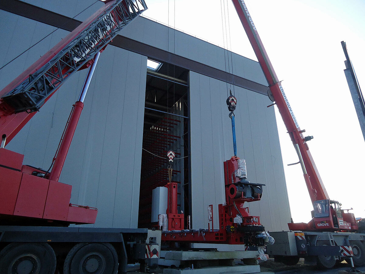 The construction of the 20 meter high building began in June 2011, and the essential building structure with floor slab, building shell, and roof was completed by the end of 2012. The assembly of the over 900 tons of rack elements began in January 2012 and was completed after four months. The first stacker crane was installed in February 2012 and in April the warehouse was put into service.