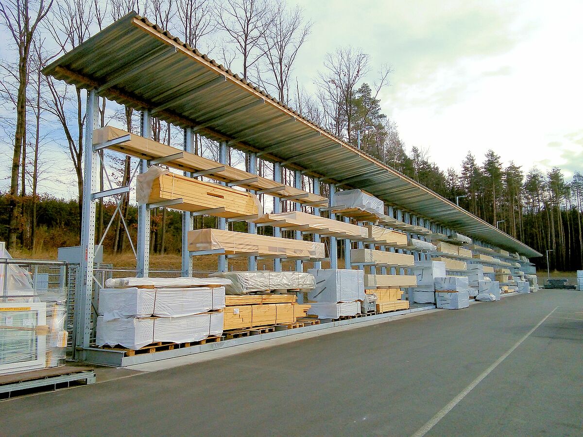 In particular, DFH Haus CZ manufactures prefabricated houses of the Okal brand – these are not small off-the-shelf projects, but individually planned and designed sustainable houses. Consequently, the storage requirements are extensive for the materials required to construct the prefabricated house components. To provide enough storage capacities for this, the company first installed cantilever racks externally in 2018, which defied wind and weather thanks to hot-dip galvanising and the sloping roof. The racks are approx. 6 metres high and offer up to five storage levels, with each of the 1.200 mm long arms carrying a weight of up to 1 tonne.