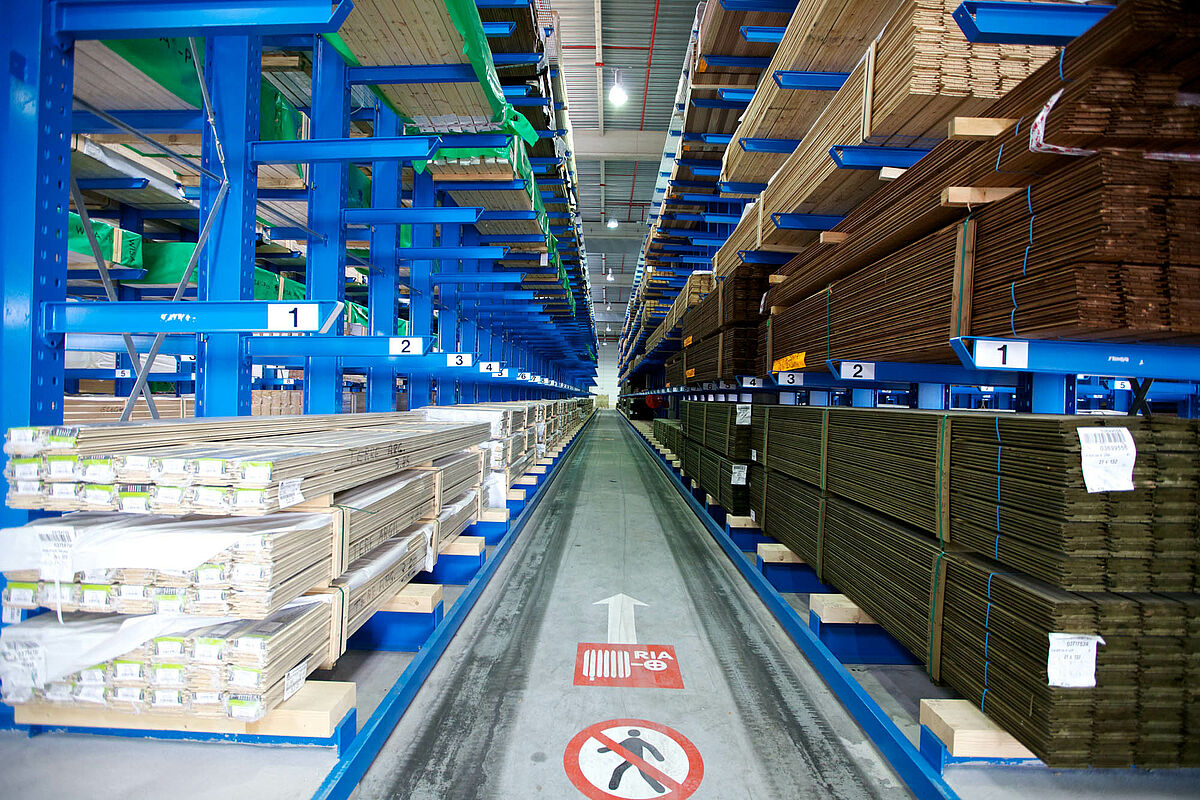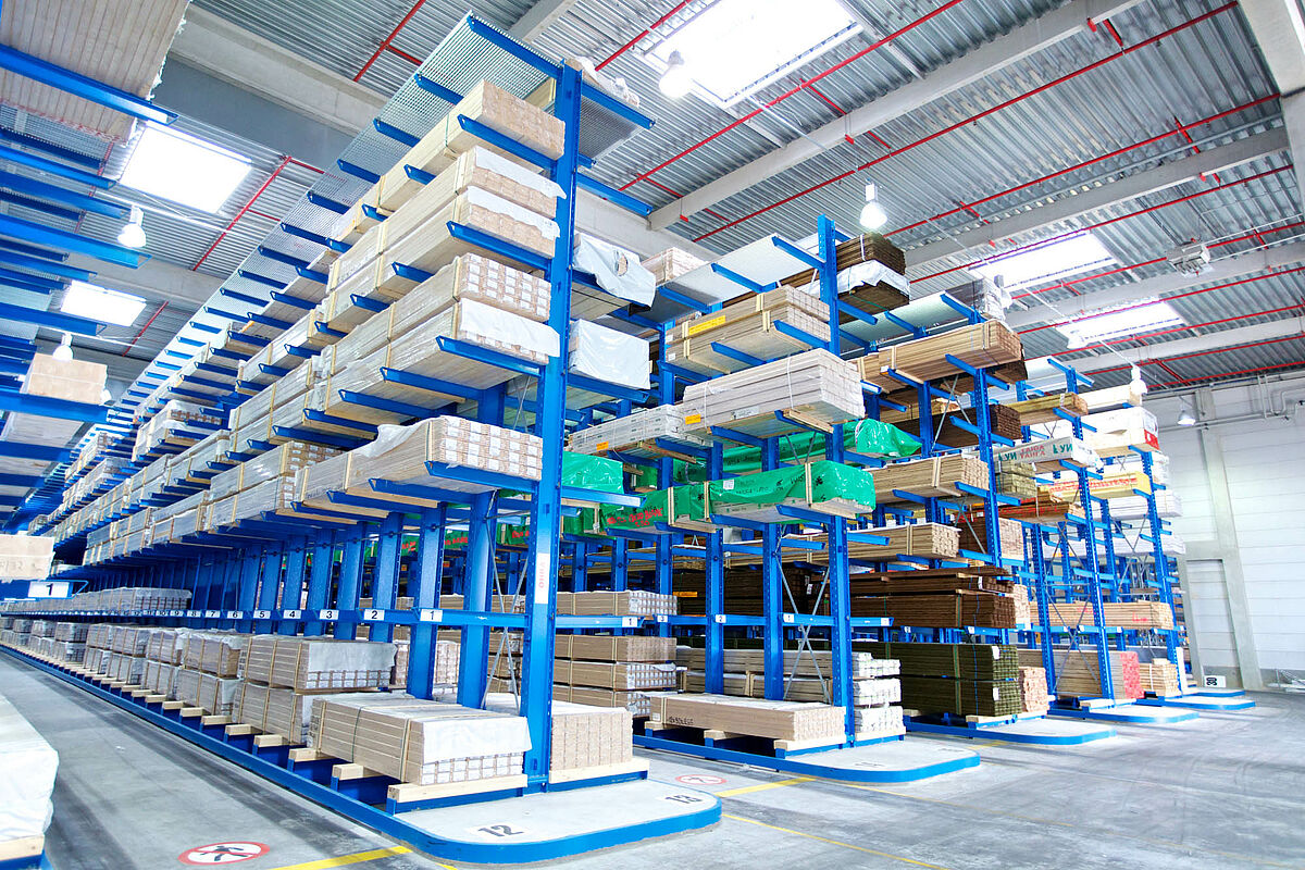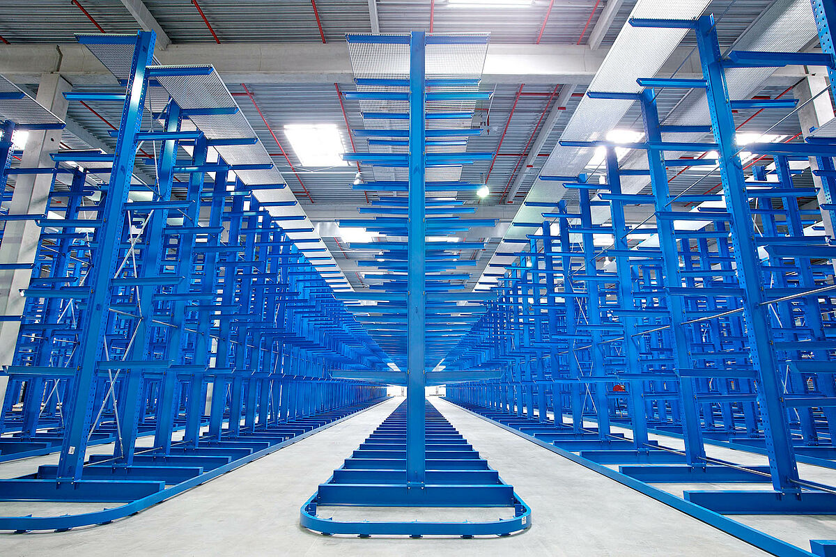 According to the plans of the technical department of the building materials supplier the new project would consist, on the one side, of a cantilever rack facility with 15 rows, each 75m in length and 8m high for the storage of long goods up to 13m in length, and on the other side, a further 10 rows with 8.5m high pallet racks also 75m in length. A total of 22 aisles were planned, of which 12 were to be realised as narrow aisle cantilever racks. Multiway forklifts were selected for the purpose of storage and stock removal.