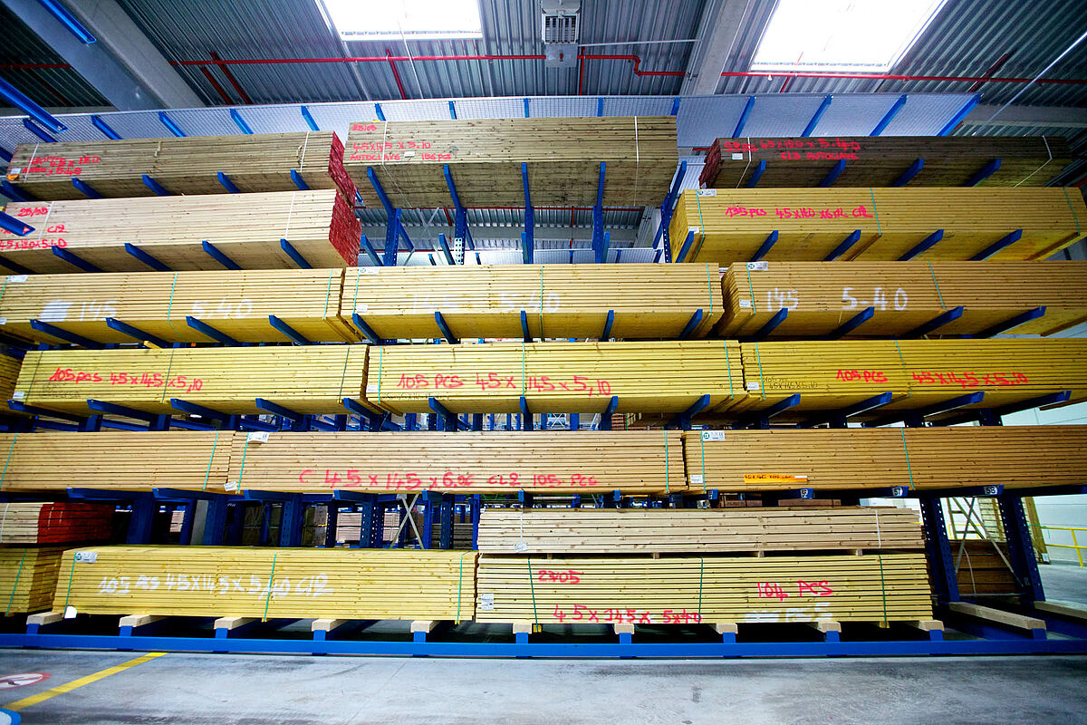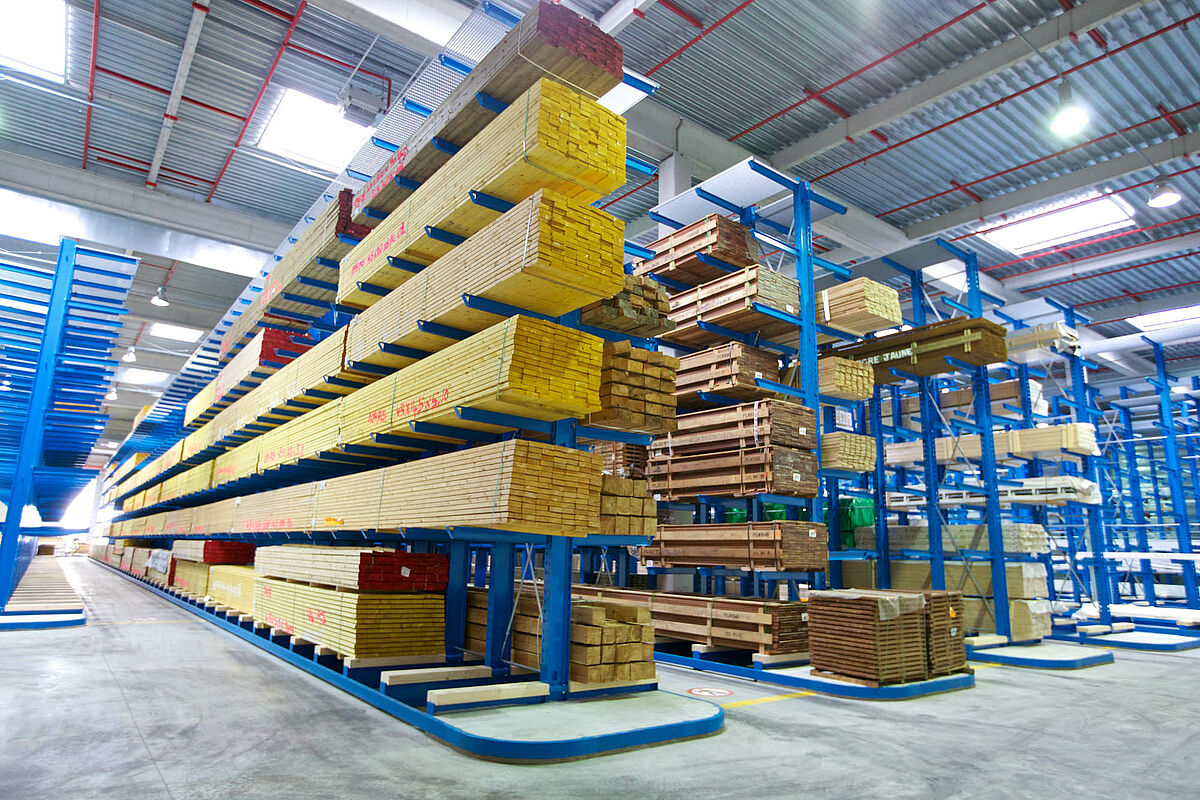 However the rack solution from OHRA also convinced in terms of the details: For example, the Kerpen based company exclusively uses solid-walled, hot-rolled standard structural steel for the cantilever racks – in contrast to sheet metal the material retains its statical properties even under rough warehouse conditions. During the handling of the warehouse stock during storage or stock removal contact with the arms can lead to damage to the goods, especially when handling wooden beams with excess length. In order to protect the stock OHRA employs self-protecting insertable arms – in the event of impacts they move upwards and to the side. Stock and rack remain undamaged.