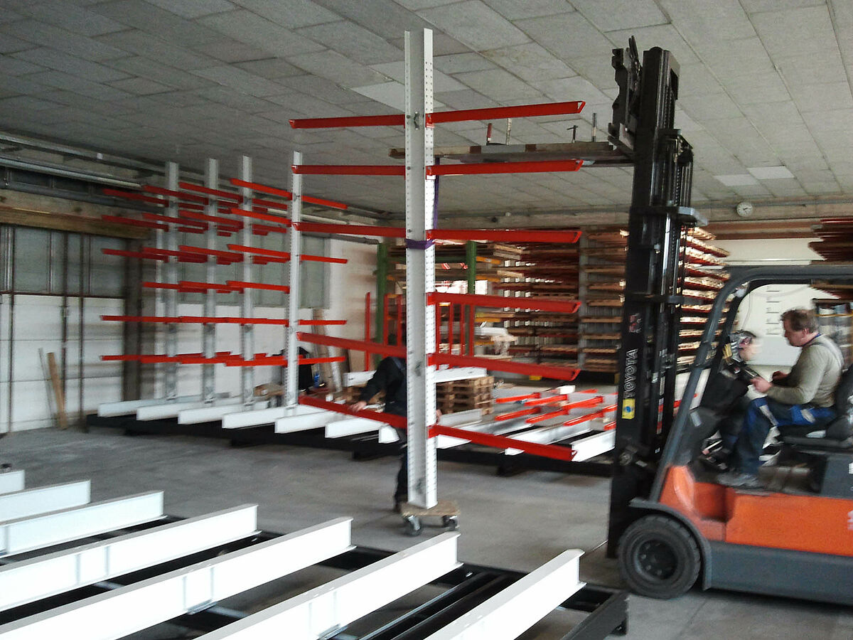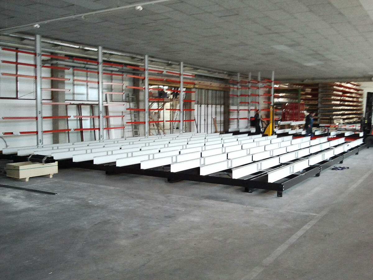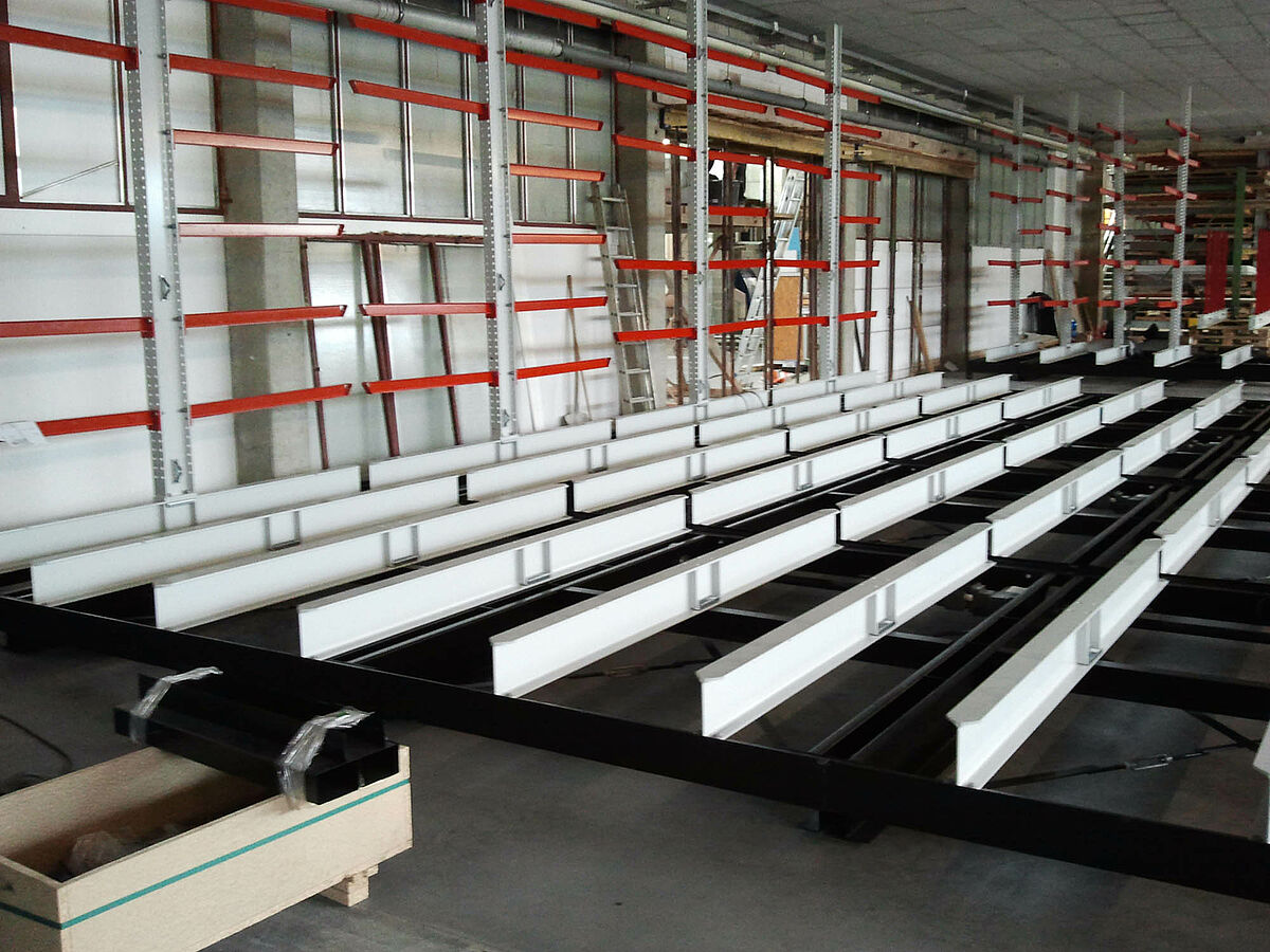 erform found a solution with OHRA: The specialist for cantilever racks based in Kerpen near Cologne provided a system enabling the racks to be mounted on carriages. These mobile racks generate almost 100 percent more storage capacity than traditional fixed racks. The experts from OHRA assembled a facility with five 9-meter long double-sided cantilever racks at the erform site. With a height of 4,080 milimetres, the racks were fitted with seven storage levels. In addition to these mobile racks mounted on carriages, a fixed single-sided rack provides additional storage space.