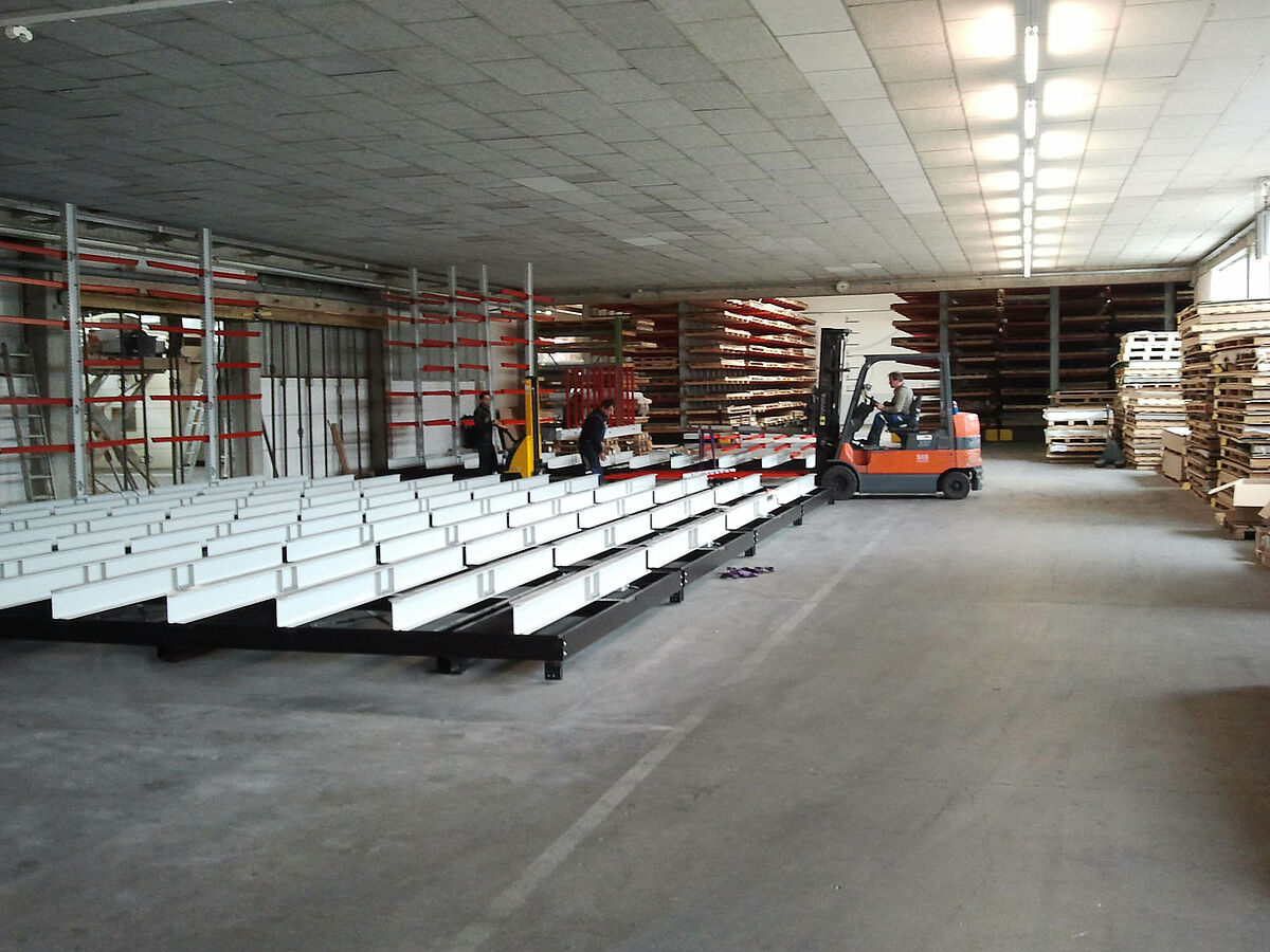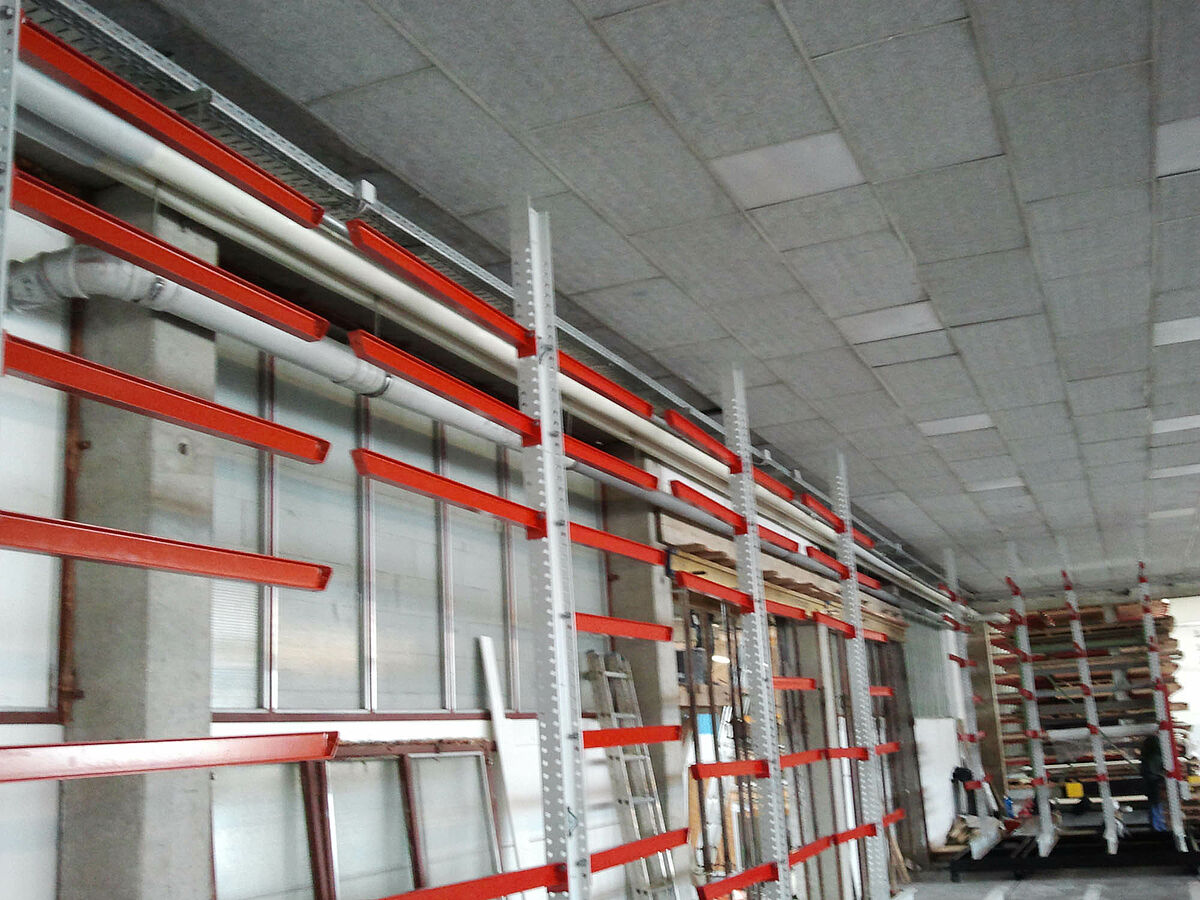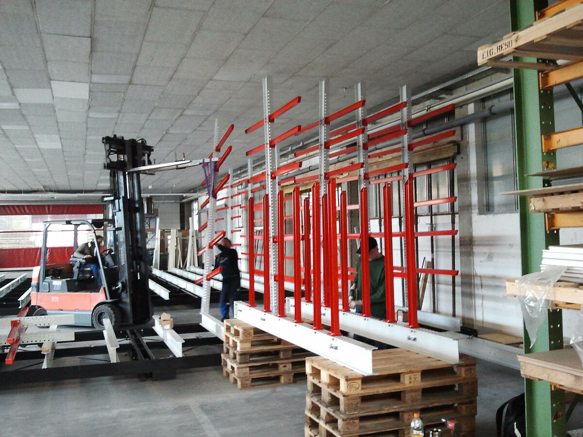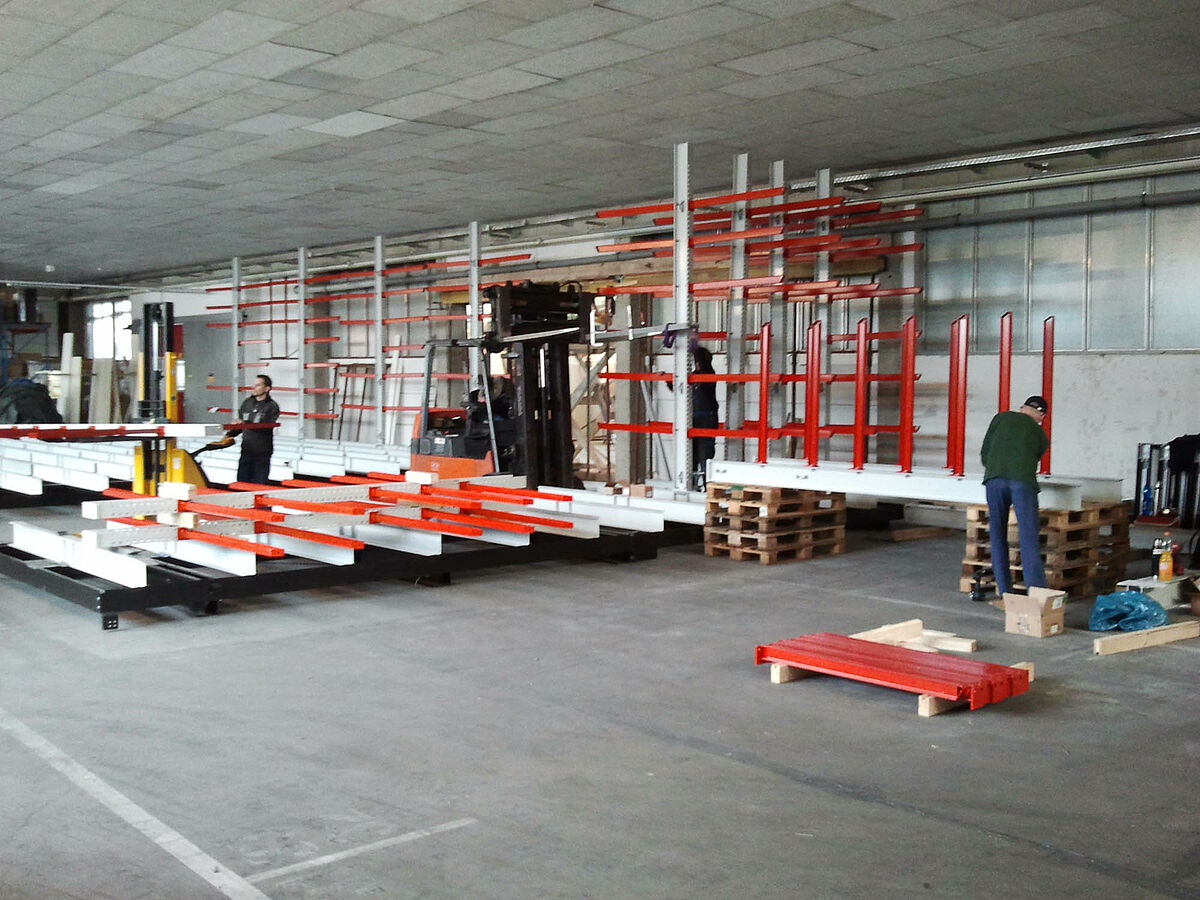 erform found a solution with OHRA: The specialist for cantilever racks based in Kerpen near Cologne provided a system enabling the racks to be mounted on carriages. These mobile racks generate almost 100 percent more storage capacity than traditional fixed racks. The experts from OHRA assembled a facility with five 9-meter long double-sided cantilever racks at the erform site. With a height of 4,080 milimetres, the racks were fitted with seven storage levels. In addition to these mobile racks mounted on carriages, a fixed single-sided rack provides additional storage space.