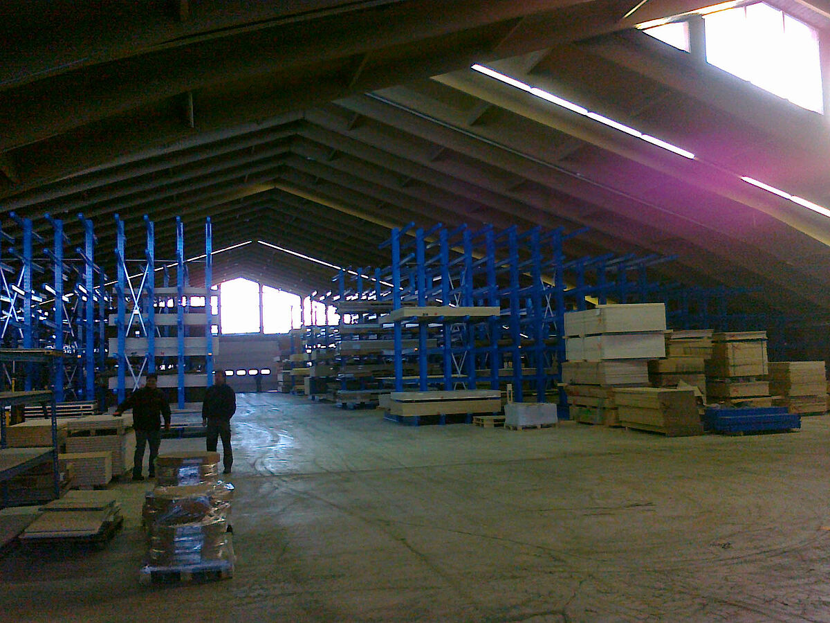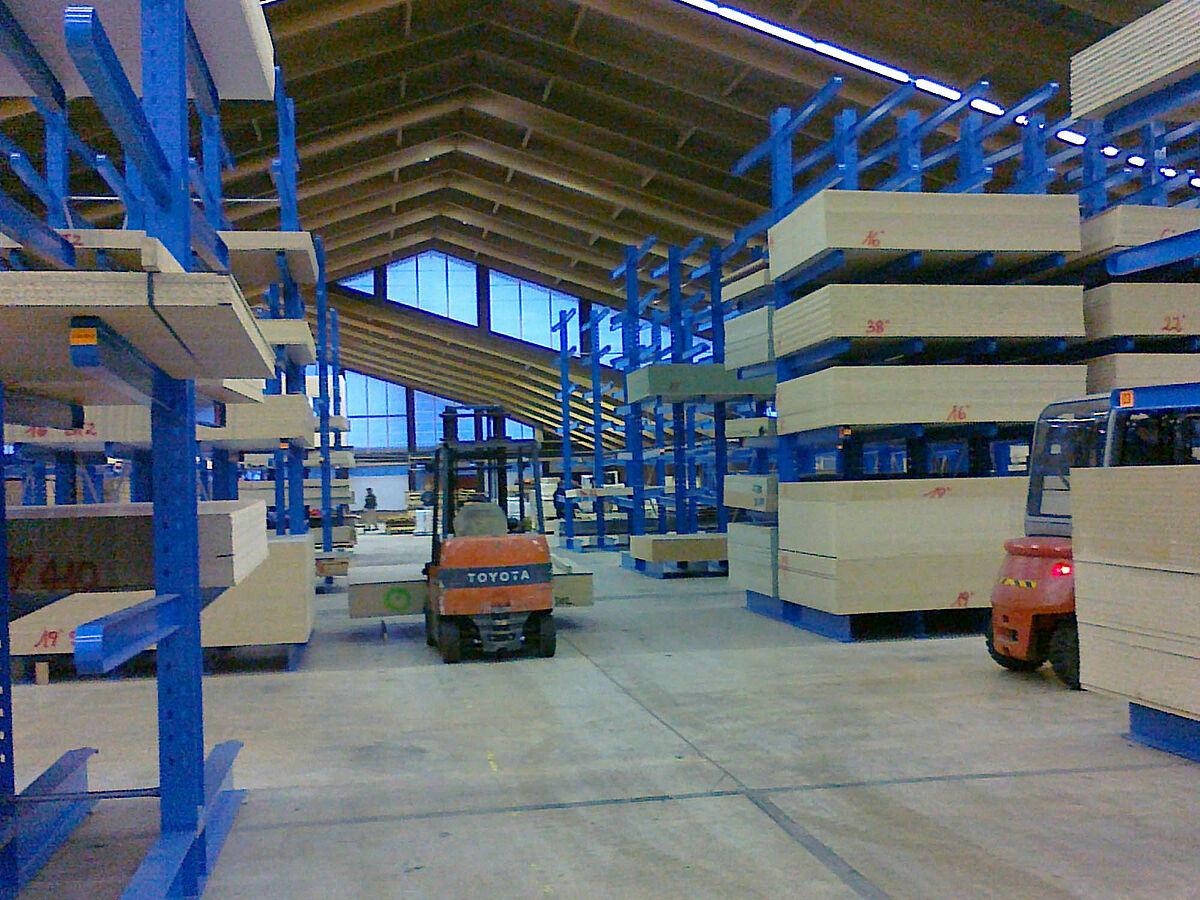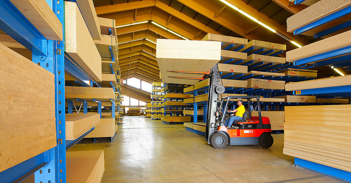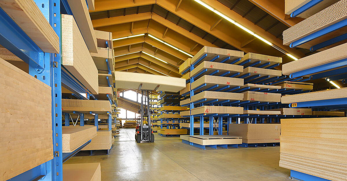 Veneers, timber, wood-based materials and boards ranging from 250 x 125 to 560 x 210 cm in size are stored at Gitsche's new distribution centre. The company had previously replaced the shelving at its headquarters with OHRA cantilever racks. Convinced of the quality of shelving made from hot-rolled standard structural steels, the timber trade company has also equipped its new distribution centre with OHRA racks.
