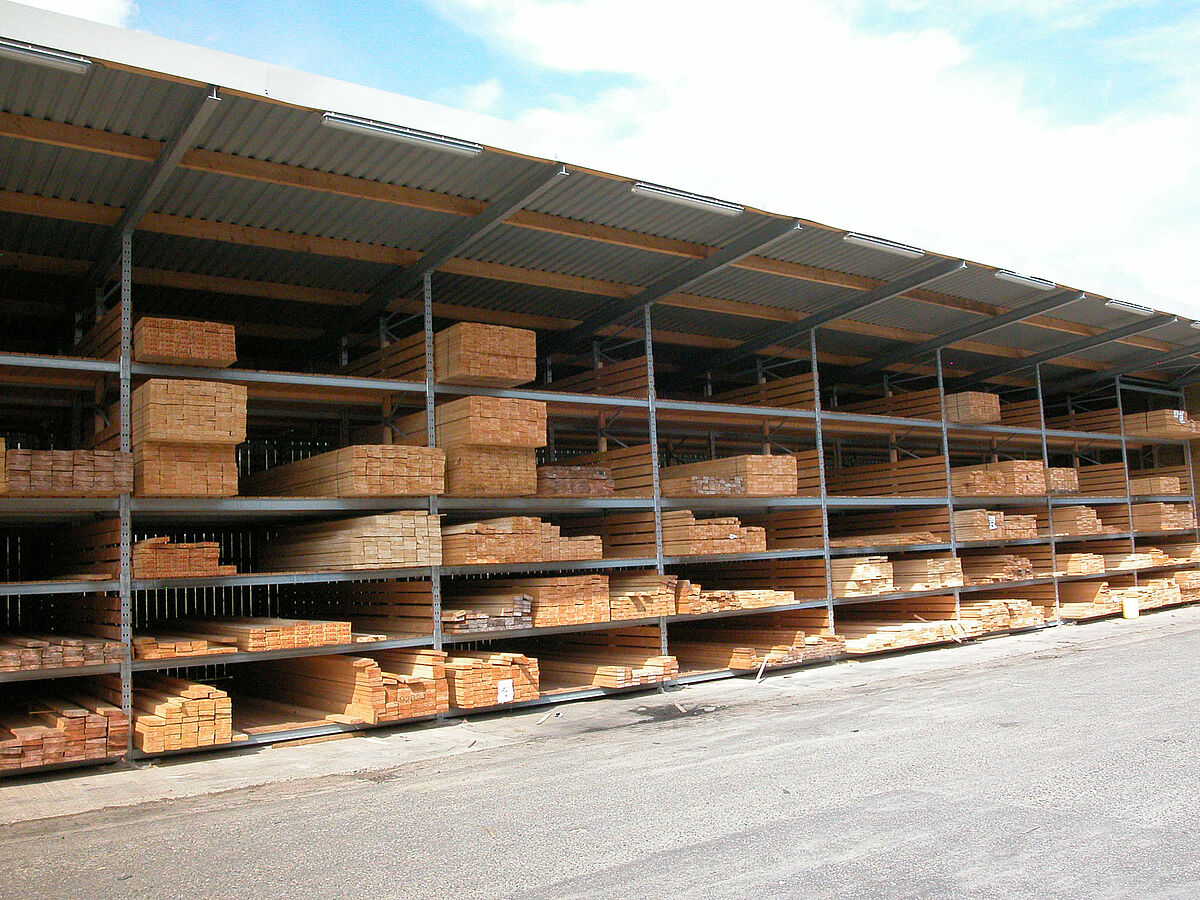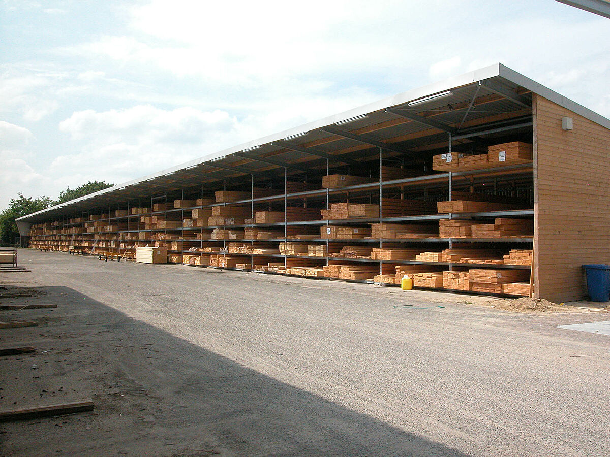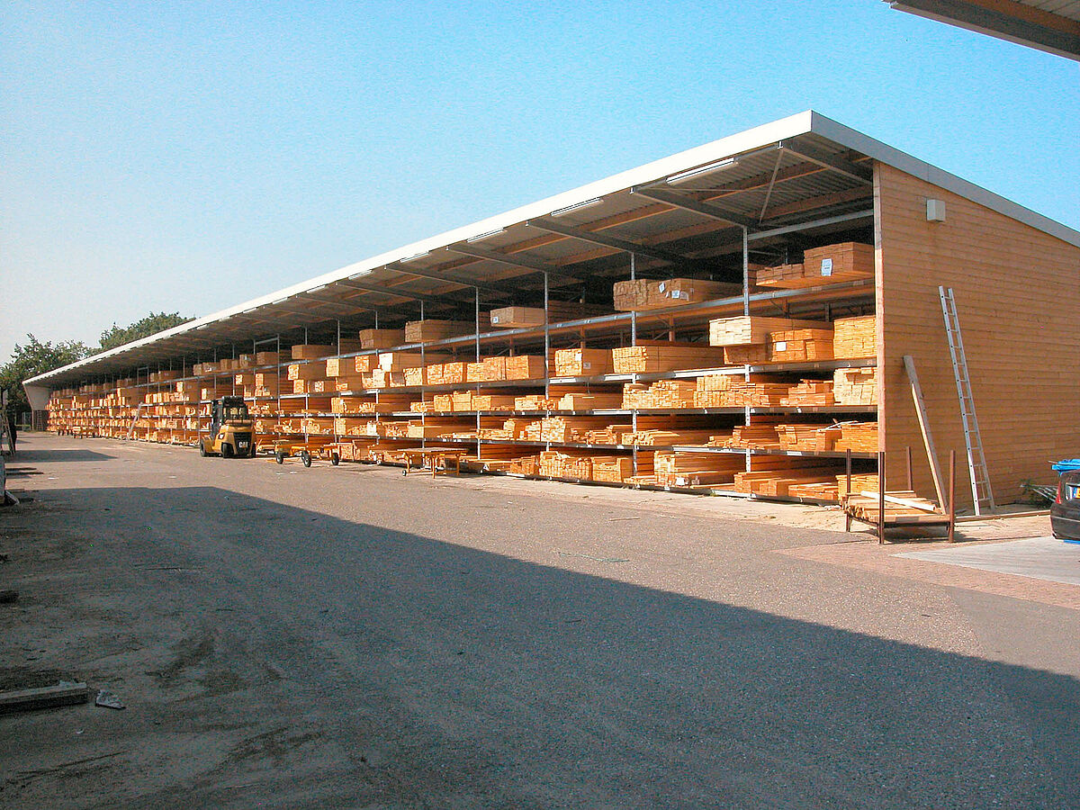 The new warehouse was realised by OHRA. The company based in Kerpen, Germany, is specialised in rack solutions for building material and wood merchants. In the case of Gooskens the palette rack system from OHRA was employed. In order to achieve the required storage depth the experts from OHRA connected a number of frames from the rack system in series, fitting them with wooden shelves. The frames are from hot-rolled steel profiles which yield elastically in the event of collisions while still retaining their high vertical load capacity. A roof on the construction protects the stored wood from the weather, turning the rack warehouse into a freestanding building. The new warehouse has an overall height of 6 meters and a length of 120 meters. The five storage levels have a load bearing capacity of 2,800 kilos respectively.