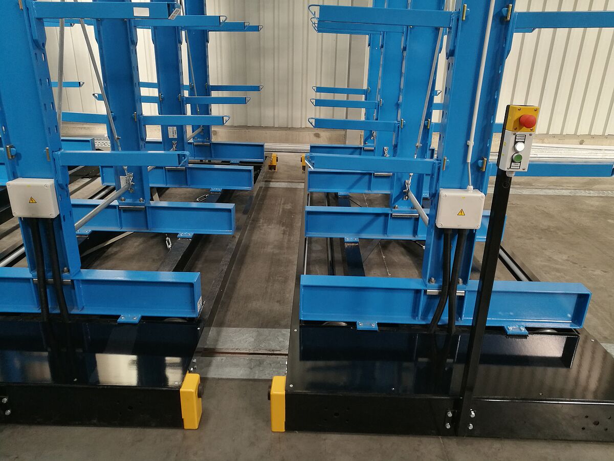 The new kitchen worktop warehouse consists of seven rows of racks. Each row is 6,600mm high, 3,300mm long and consists of four columns each, onto which nine cantilever arms are attached. This results in a total of ten storage levels – the lowest level being on the bases. The outer lines are single-sided and fixed to the ground, the remaining lines are mounted on carriages that move on rails laid in the ground. The carriages stand close to each other, with the racks mounted on them. If goods are needed from a specific rack, the carriages move apart and open the desired aisle. The control is carried out by the forklift via remote control – a manual operation is also possible. With such a system, the highest possible utilization of space is possible; compared to conventional “rigid” racks, almost 100% more storage capacity can be achieved.
