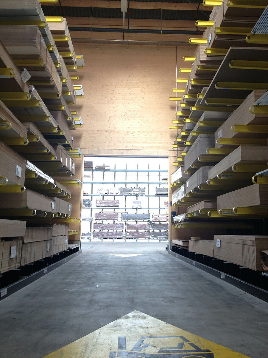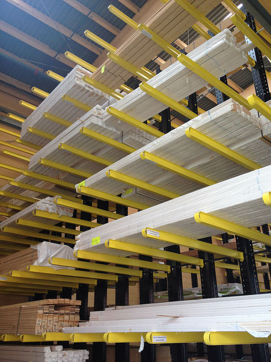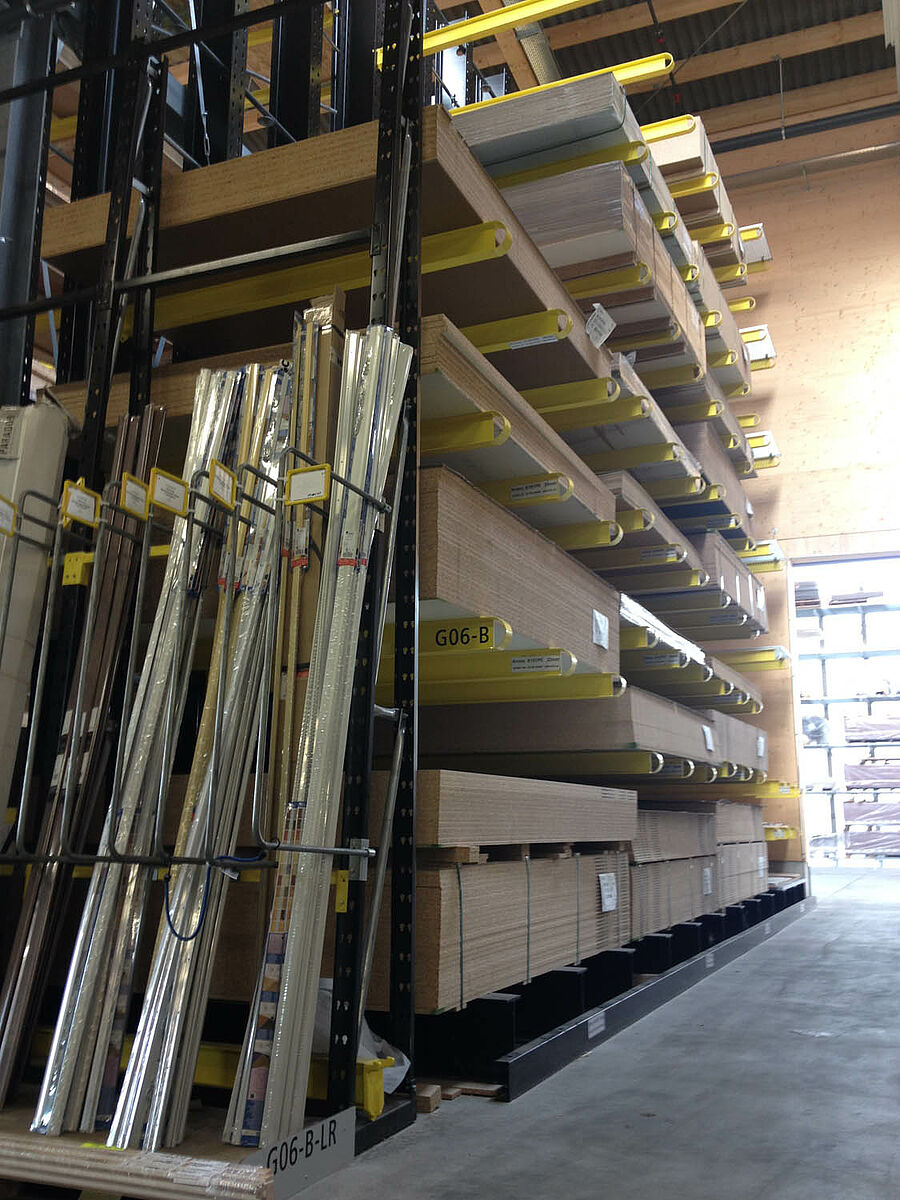 The warehouse in Biel is divided into two drive-through zones covering an area of around 3,000 square meters. In the warehouse OHRA assembled around 600 meters of cantilever racks to a height of 9 meters, composed of seven storage levels employing cantilever arms, generally with a depth of 2.5 meters, serviced by 4-way forklifts. In addition, vertical racks at the ends of the rows of racks facilitate the systematic storage of battens, profiles, and tubing. Hot-dip galvanised pallet and cantilever racks in the outside area provide space for a further 600 pallets. A 1,000 square meter platform has been integrated into the warehouse construction for the storage of insulation material.