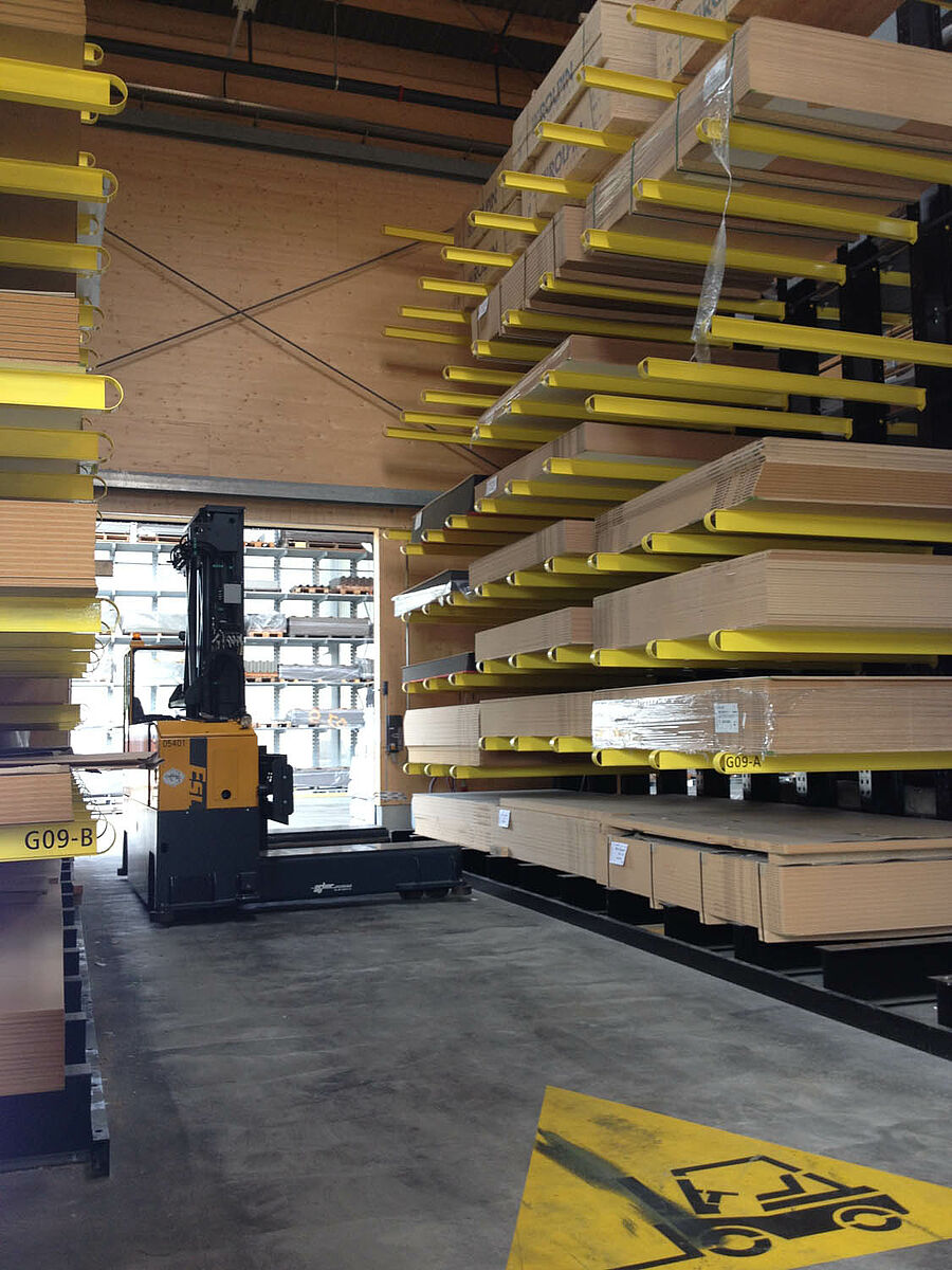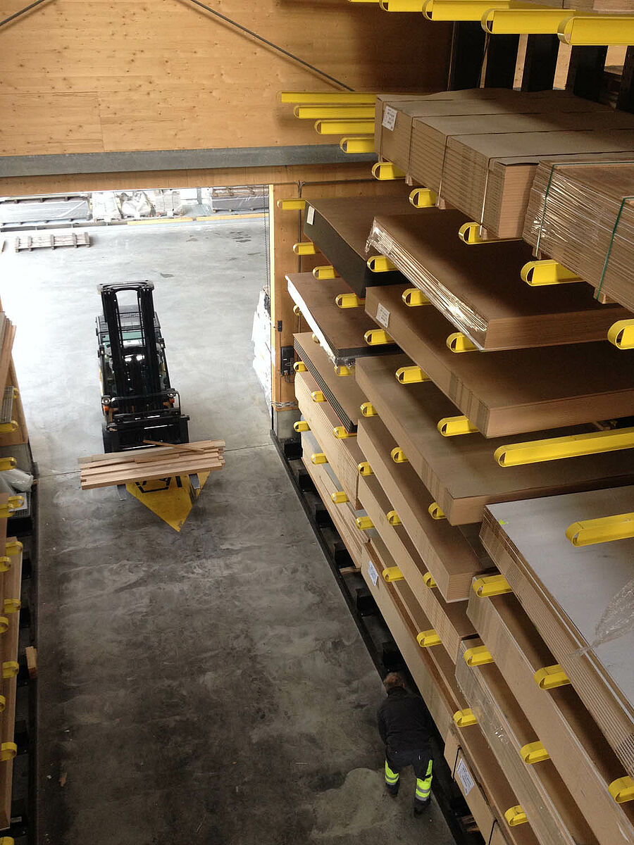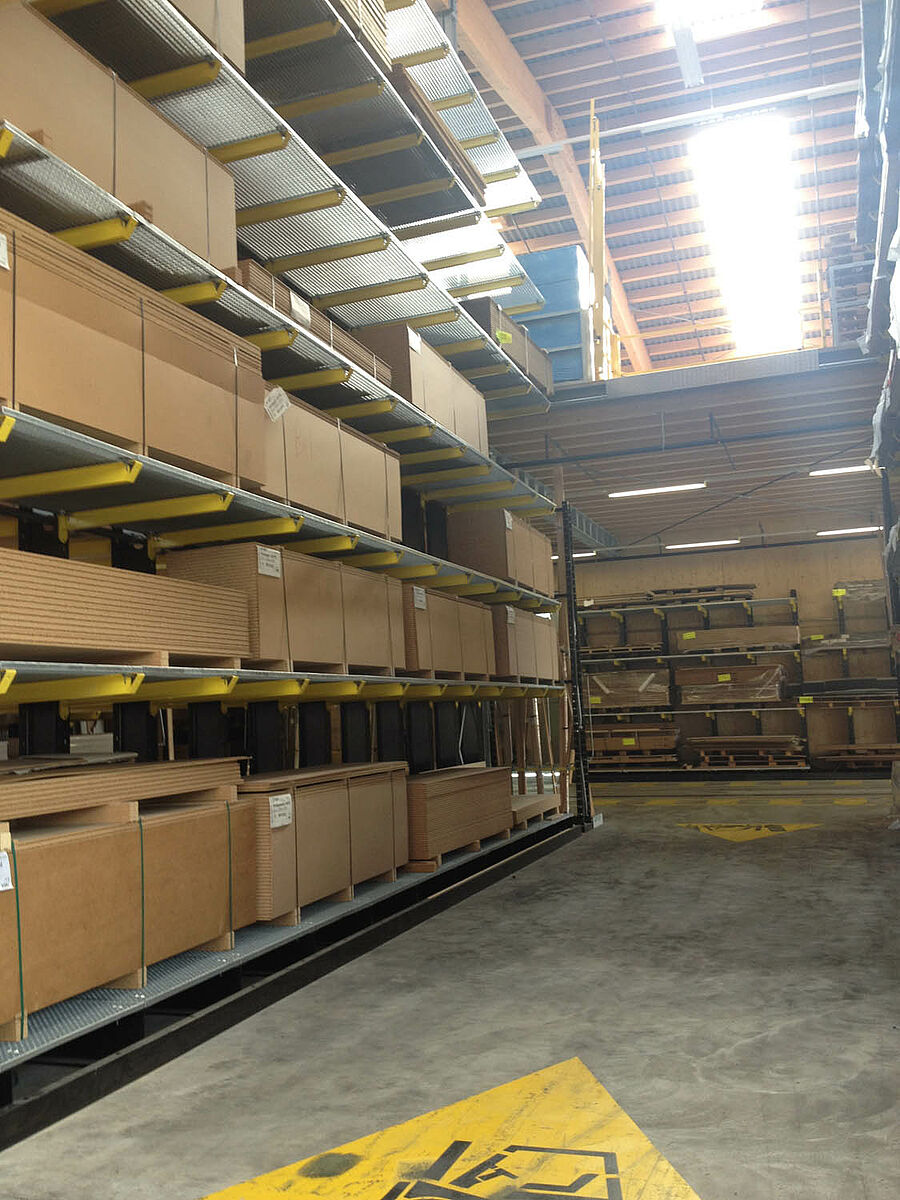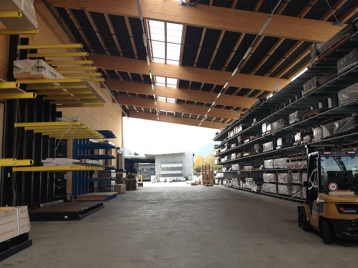 The warehouse in Biel is divided into two drive-through zones covering an area of around 3,000 square meters. In the warehouse OHRA assembled around 600 meters of cantilever racks to a height of 9 meters, composed of seven storage levels employing cantilever arms, generally with a depth of 2.5 meters, serviced by 4-way forklifts. In addition, vertical racks at the ends of the rows of racks facilitate the systematic storage of battens, profiles, and tubing. Hot-dip galvanised pallet and cantilever racks in the outside area provide space for a further 600 pallets. A 1,000 square meter platform has been integrated into the warehouse construction for the storage of insulation material.