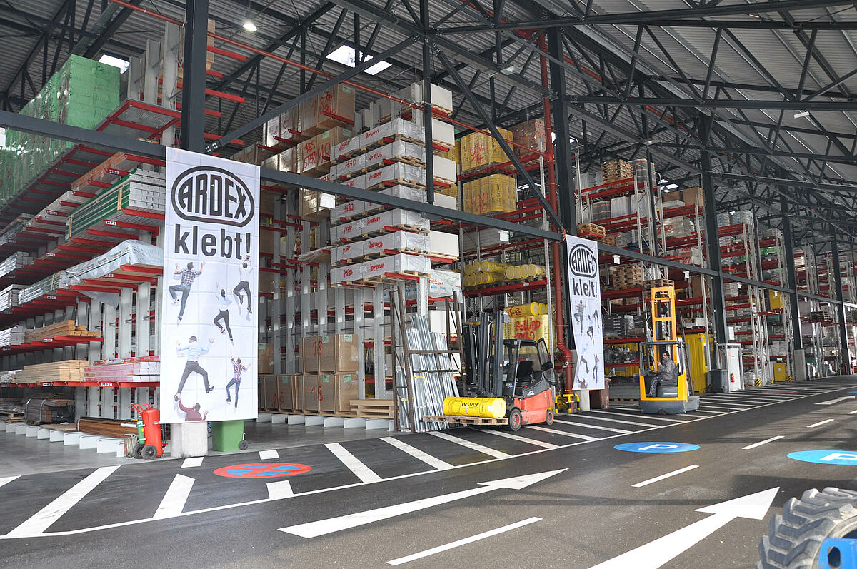 Here, long materials for the timber, civil engineering, gardening and landscaping sectors, as well as heavy goods from the natural stone or concrete block ranges are stored. Additionally, depending on the season, articles from the building supplies superstore, such as lawn mowers, are stocked.
