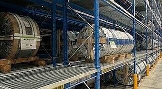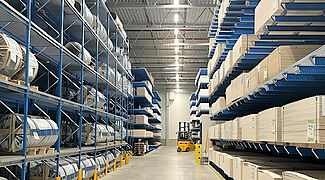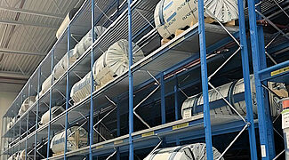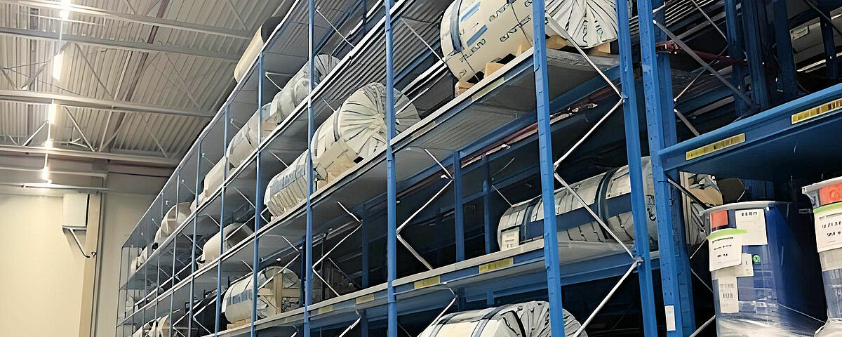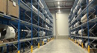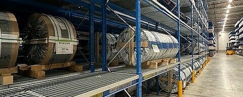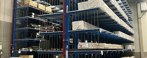 The mix of cantilever and pallet racking enables the storage of materials as diverse as adhesives, aluminium and GRP coils, plywood packages, PVC flooring or wooden and polyurethane foam strips. One of the advantages of OHRA shelving, which is made of hot-rolled steel profiles, is its high load-bearing capacity.: At Knaus Tabbert, for example, the cantilever racks carry up to 12 tonnes per upright, and the load capacity of a single cantilever is up to 1,000 kilograms - even at the highest storage level at a height of 7.5 metres. The GRP coils weighing up to 1.2 tonnes and the sheet metal coils weighing up to 1.8 tonnes are stored in pallet racks. Mesh shelves allow flexible storage regardless of the format of the coil loading aids. In the cantilever racks, too, mesh shelves sometimes ensure that a wide variety of containers and load carriers can be stored.