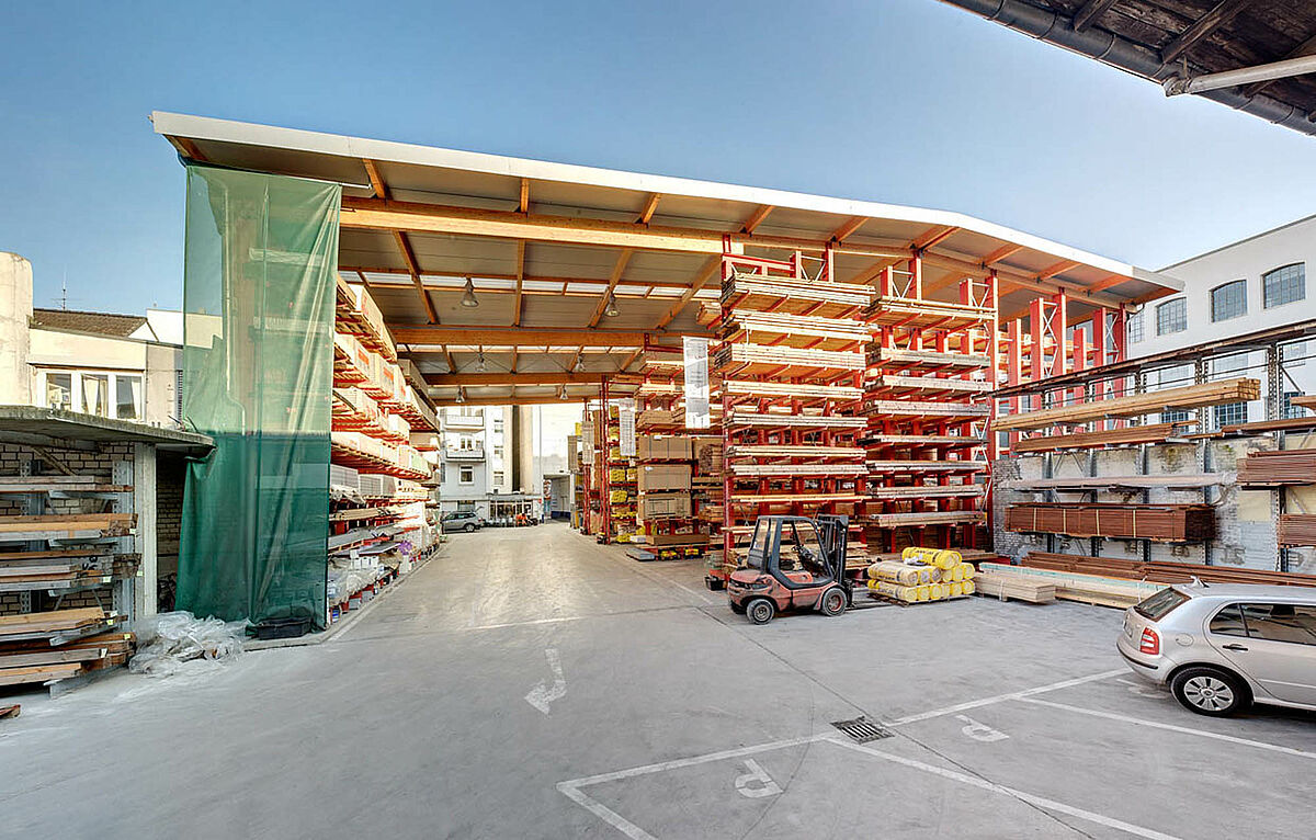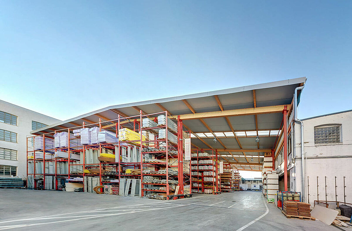 The newly created storage warehouse is a "specialty" of OHRA. It supports that and framework of the cantilever and pallet racks used for storage next to the function simultaneously as a supporting substructure for roof and wall. Each two roof base pallet racks and cantilever racks with a height of 9,500 mm support the entire structure. Additionally a covered loading area of 10 meters projection is realized. The roof in glue wooden truss version was provided by customer service.