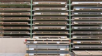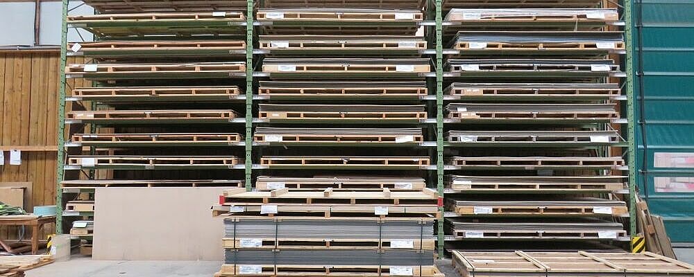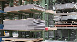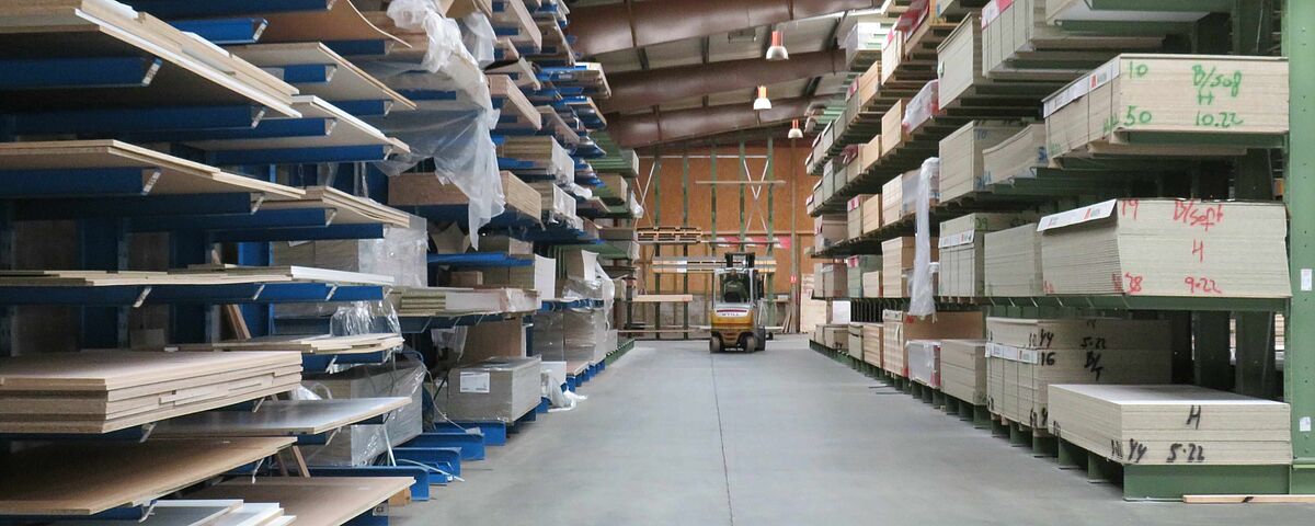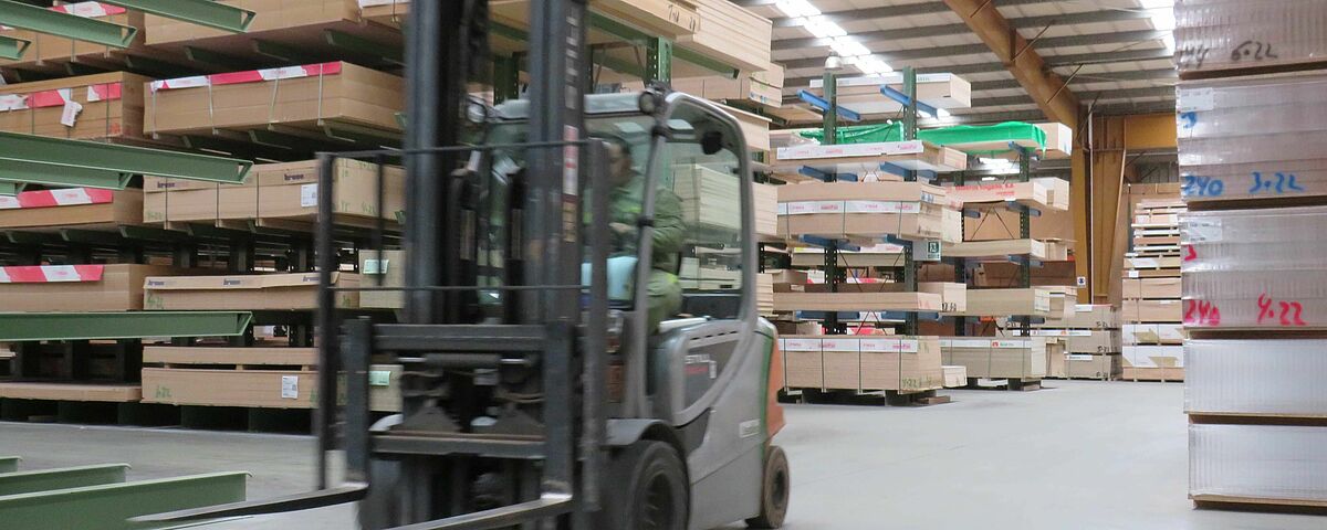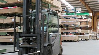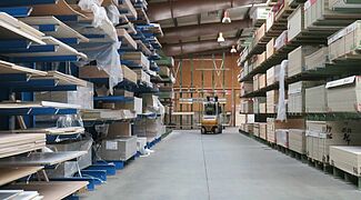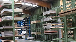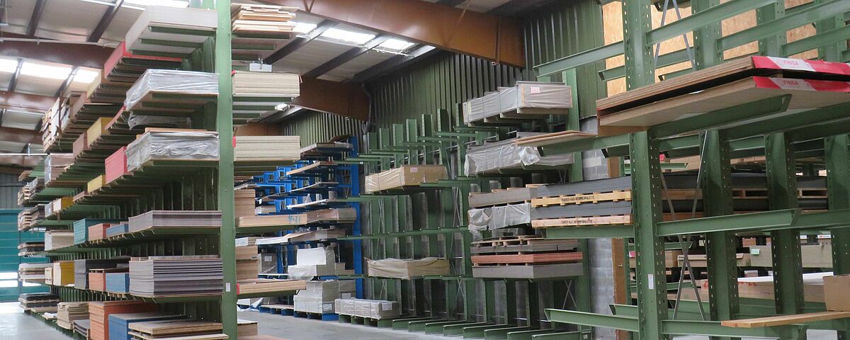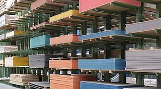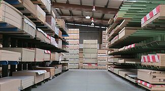 OHRA therefore installed various racking systems in the storage area: These include cantilever racks, whose 1,300mm long arms each have a load capacity of 750 kilograms; the top storage level is 5 metres. This is where mainly panels are stored that have a high turnover and need to be retrieved quickly. Since many different articles which are stored on special pallets 3050 x 1300mm had to be accommodated in the HPL panel area, a pallet rack is used here: With a length of around ten metres and a height of approximately 6 metres, it has 15 storage levels. This creates many storage compartments, which enables item-specific storage per shelf compartment and thus fast access to the goods.