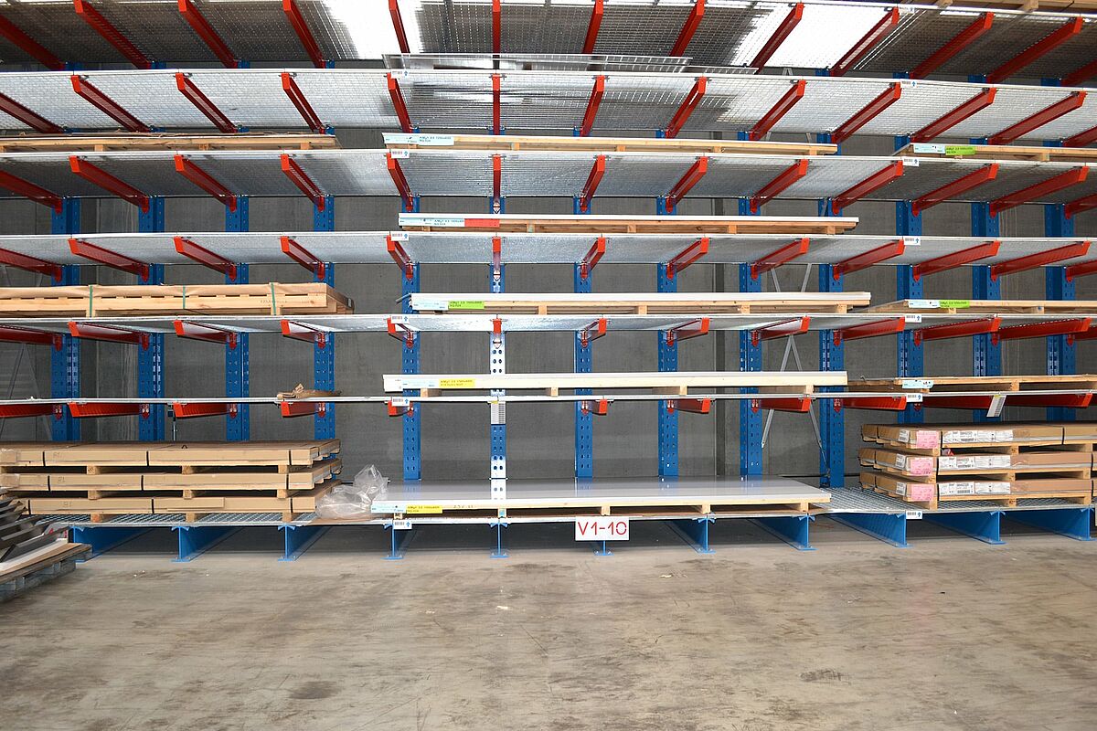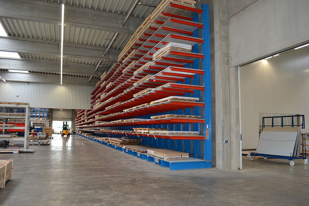 Today, a total of seven single-sided cantilever racks between 3.6 and 76.5 meters in length stand in Ronge Profil's modern production hall. With 10 storage levels – the highest at a height of 6,800 mm – they offer adequate storage capacities for flexibly supplying production with the necessary sheet metal elements. Double allocations are no longer required – this means that the effort and expense for storage and retrieval are reduced.