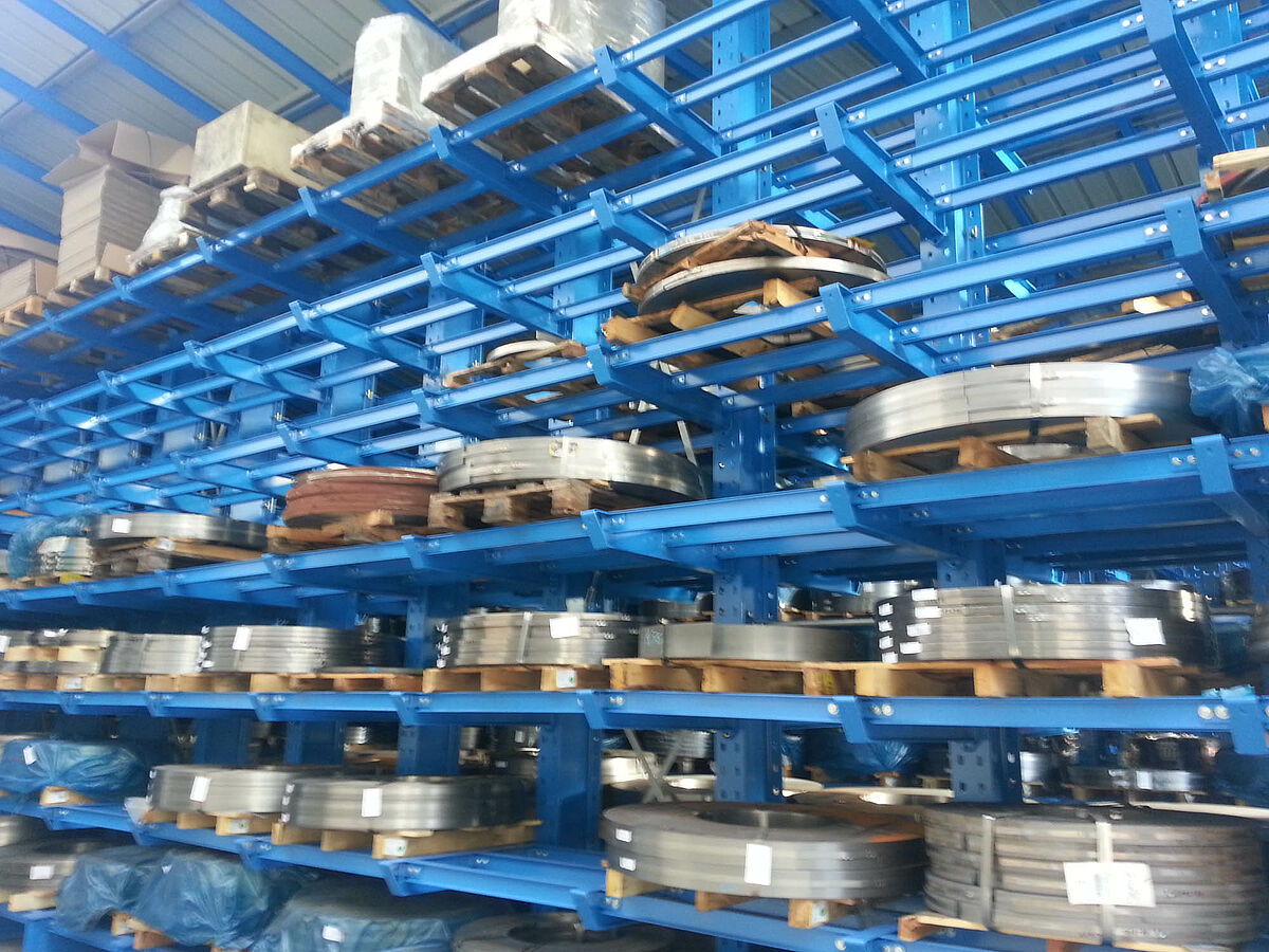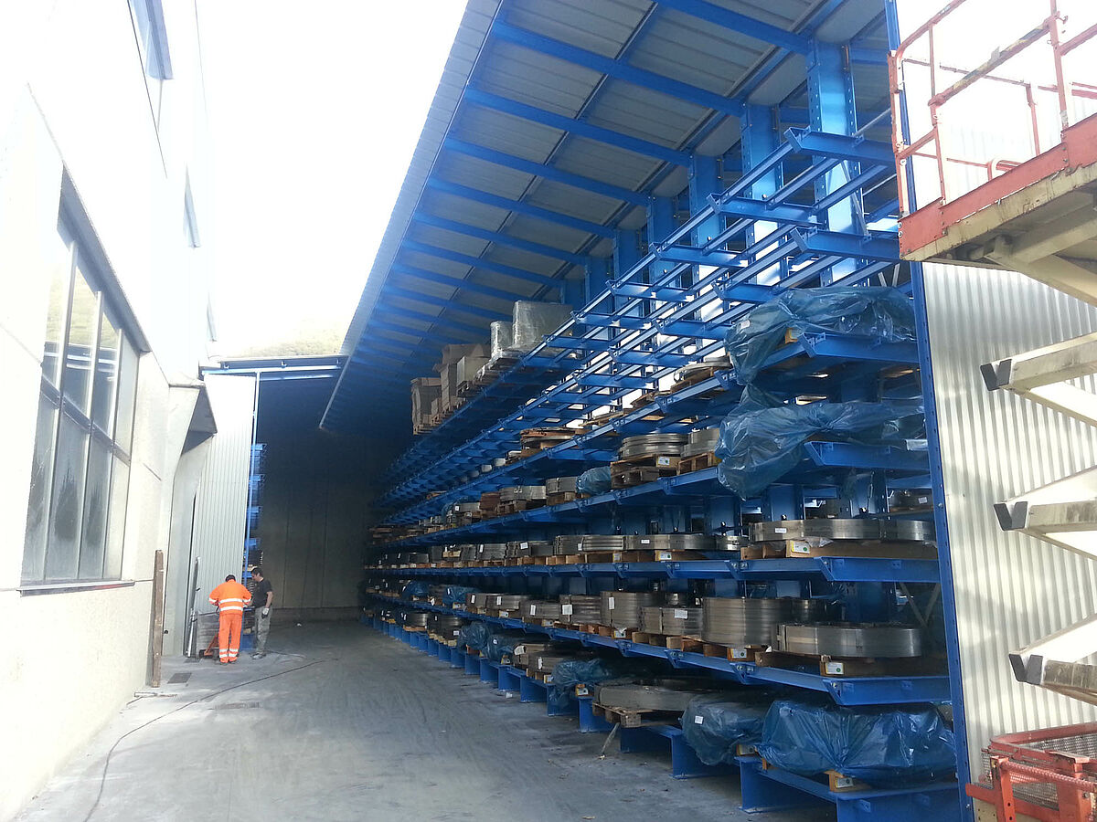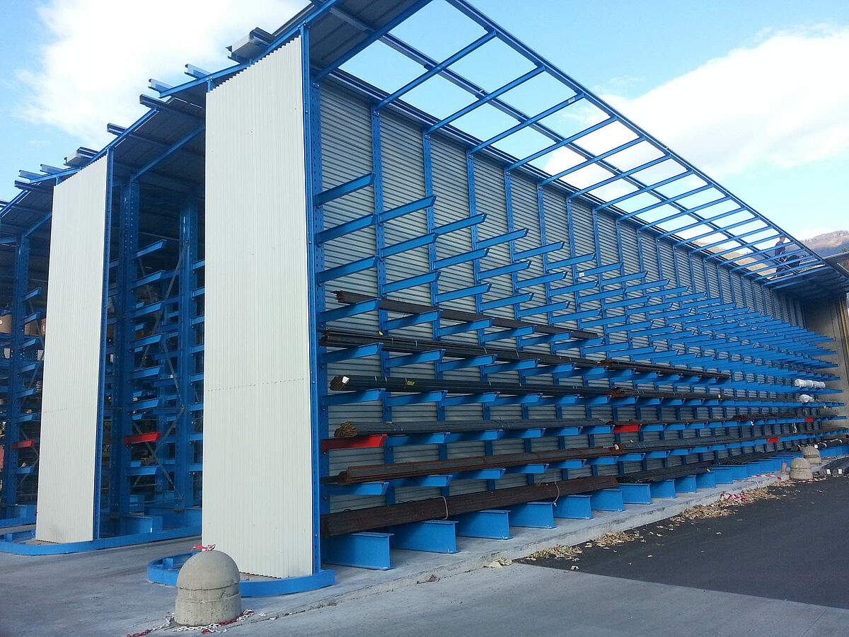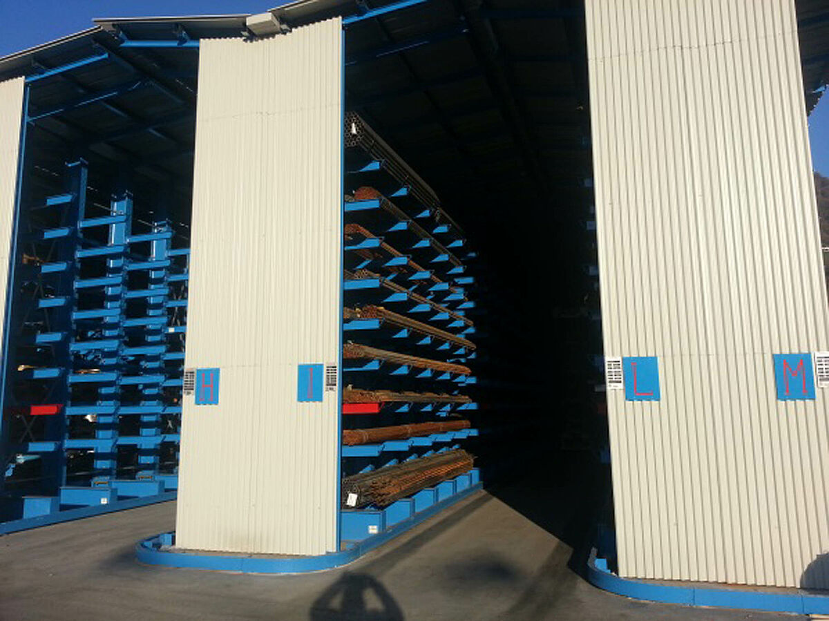 The overall warehouse has floorspace of about 900 square metres and consists of five 30-metre-long rows of double-sided cantilever racks and one single-sided row of racks. OHRA's rack systems are made of stable, hot-rolled steel profiles that make possible tall overall heights and high load-bearing capacities. In addition, the robust construction reduces the time and costs of repairs and maintenance of conventional rack structures made of sheet metal profiles that result from collision damage or similar issues.