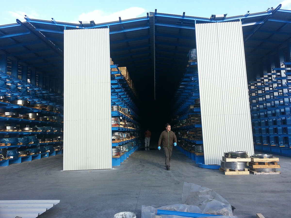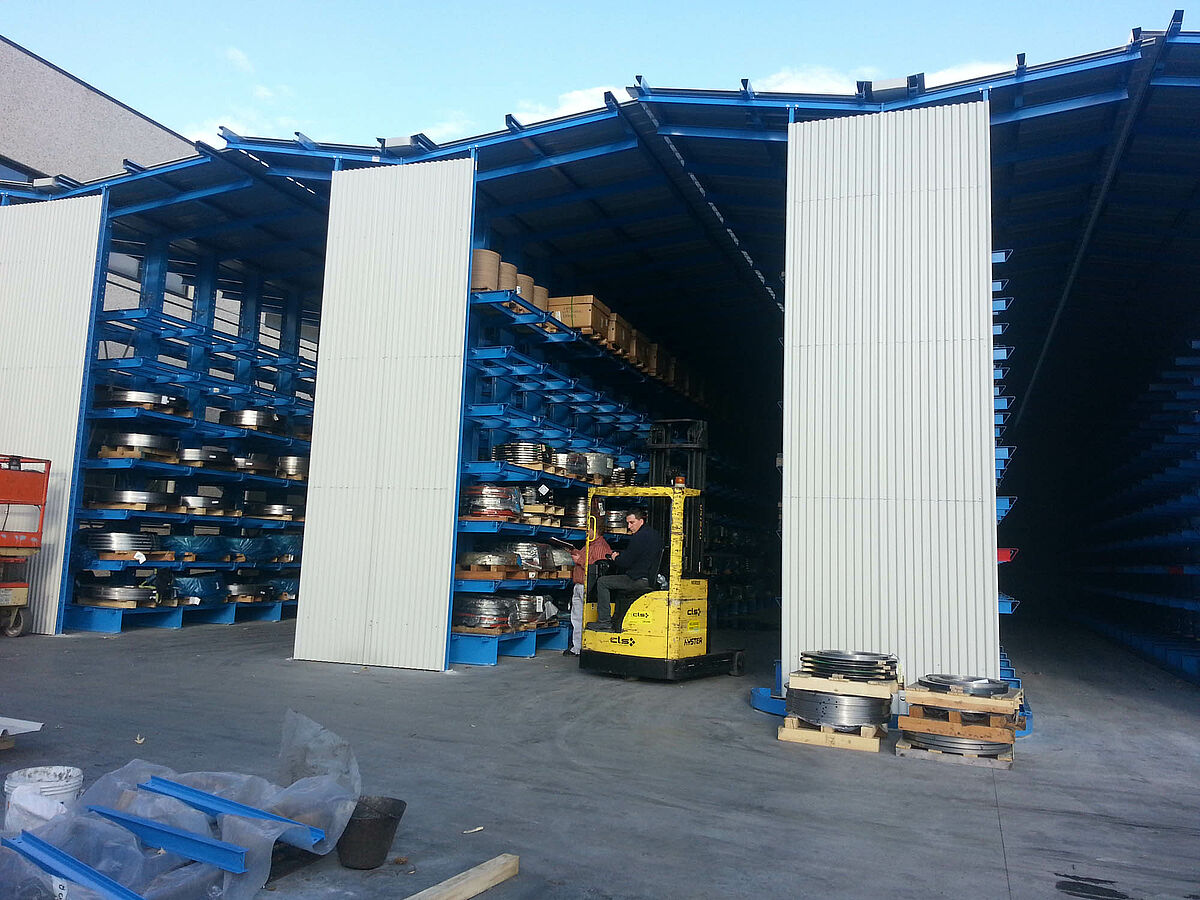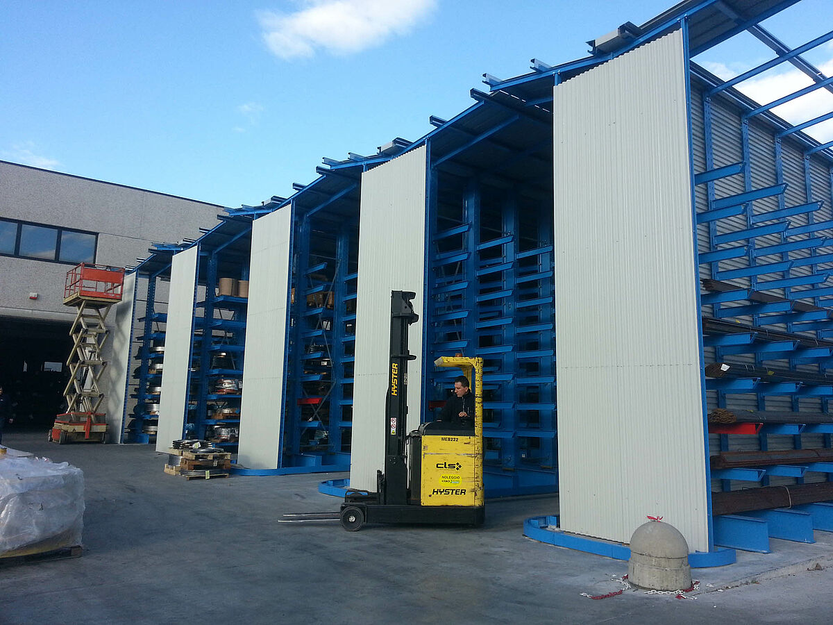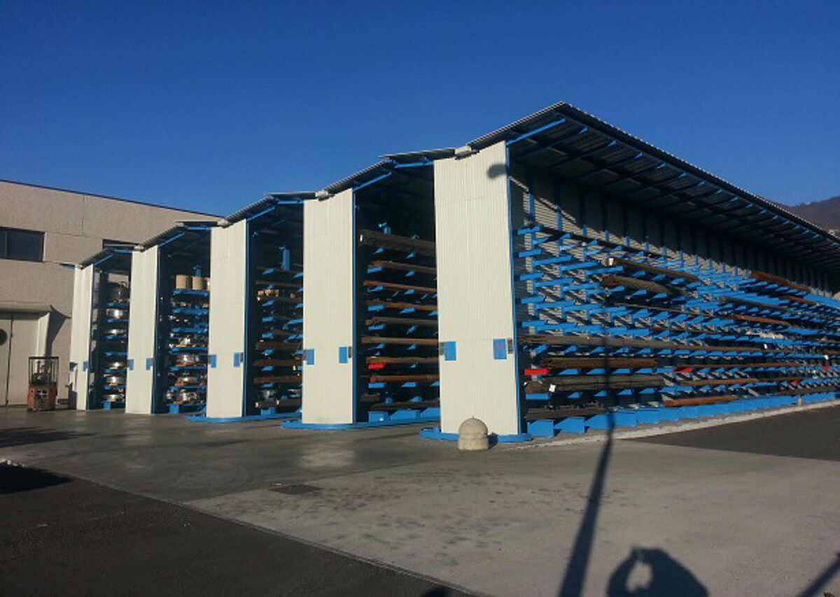 At their Caloziocorte site, Rosa Catene produce chains for agricultural, industri-al and commercial applications. The company's ongoing growth made it neces-sary to build a new raw material warehouse for palletized strip sheet metal and bundled steel rods. OHRA was awarded the contract to build the warehouse: The company headquartered in Kerpen, Germany, specializes in cantilever rack systems and convinced Rosa Catene by presenting a concept in which the stands of the rack supports were at the same time a bearing structure for the building. In the suggested concept, the roof elements of the six rows of racks overlap. This results in a completely covered modular warehouse that can be easily extended in the future. In addition, this structure offers considerable cost benefits and can be constructed much more quickly than a conventional build-ing.