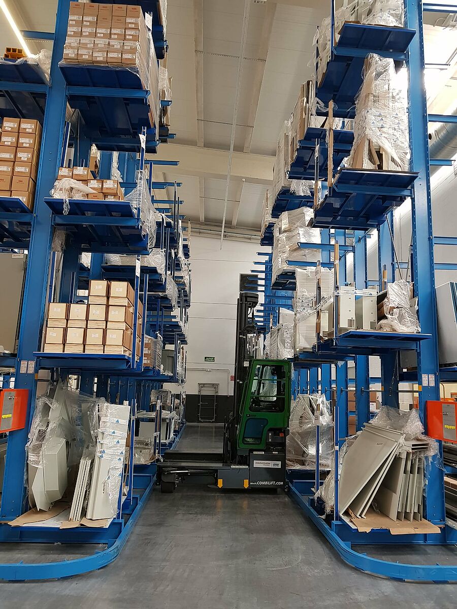A total of seven cantilever racks with lengths between 15.1 and 22.5 metres were installed. In contrast to pallet racks, cantilever racks allow the storage of articles with different widths, since there are no interfering intermediate uprights. At the same time, Seuner can also store bars or similar long goods in the rack system. Since all load-bearing elements of OHRA racking systems consist of solid steel profiles, the construction of a narrow storage system with a high load-bearing capacity is possible. Each side of the racks, which were installed for Seuner, carries a weight of 3,280 kilograms per side, while cantilever arms with a length of 1.15 metres have a load-bearing capacity of 820 kilograms. The guide rails attached to the racks allow the use of a forklift truck for narrow aisles. In addition, Seuner installed several OHRA pallet racks with five storage levels and bay widths of 3 and 4 metres. The SWL capacity per bay is 3,000 and 4,000 kilograms.