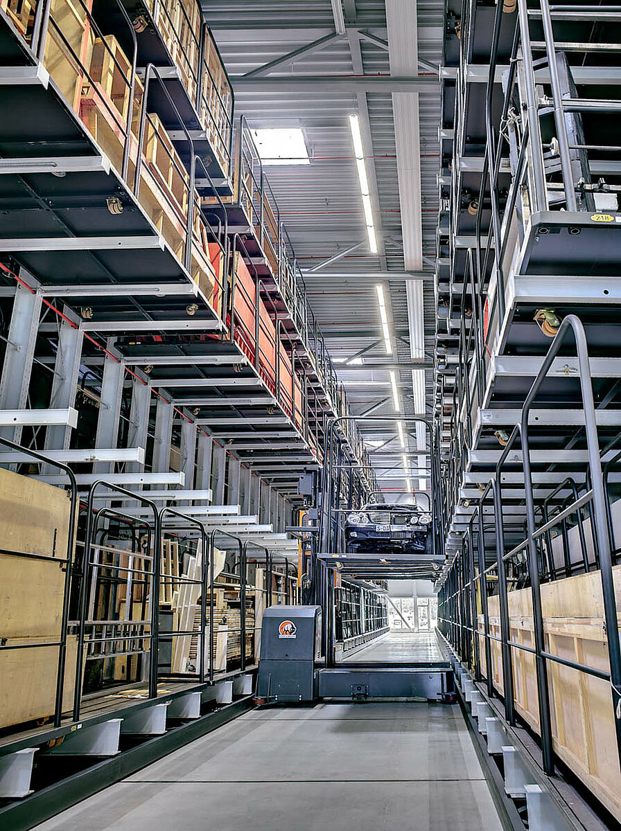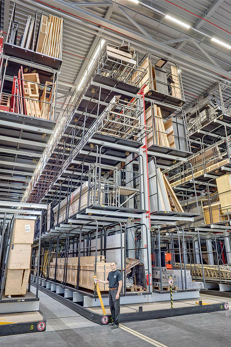 The 8 movable double shelves of nearly 60 m in length have a capacity of 180 tons each. The backdrop will be in- and outsourced by means of a four way forklift with a retractable cabin.