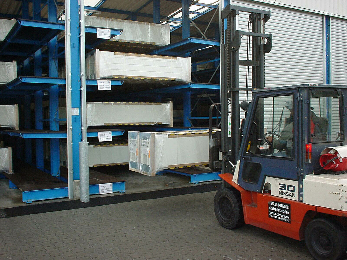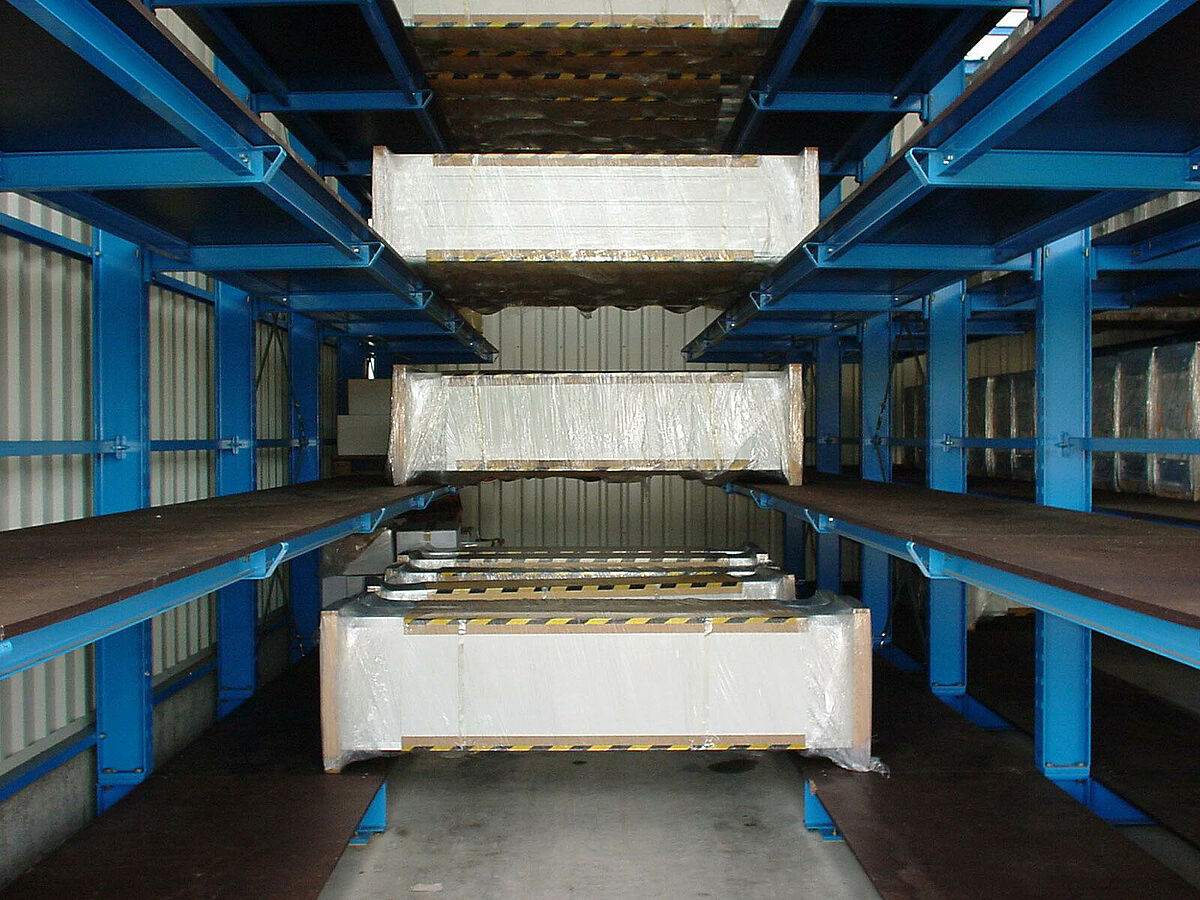 At the same time, the levels of the cantilever rack are used as supporting space in the depth. The gates can be stored arranged in the corresponding lanes and are now stored with the maximum exploitation of existing storing-space. With only a few forklift truck liftings a total lane can be cleared and be unloaded on a lorry.