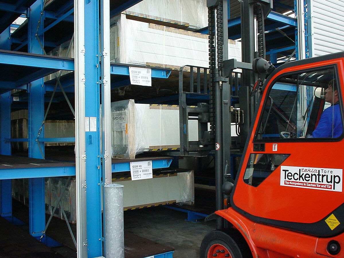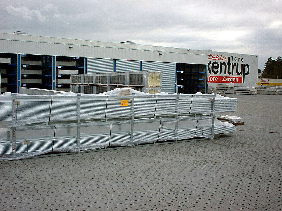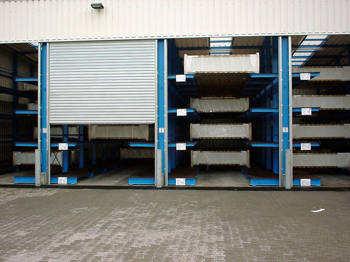 Due to an increase in sales, an extension of the warehouse for finished products was necessary, considering the special requirements of the storage of small lines. After a few planning conversations, a new type of drive-in racking system based on cantilever racks has been designed which allows to store gates with a width of 4.2 m up to 6.5 m.