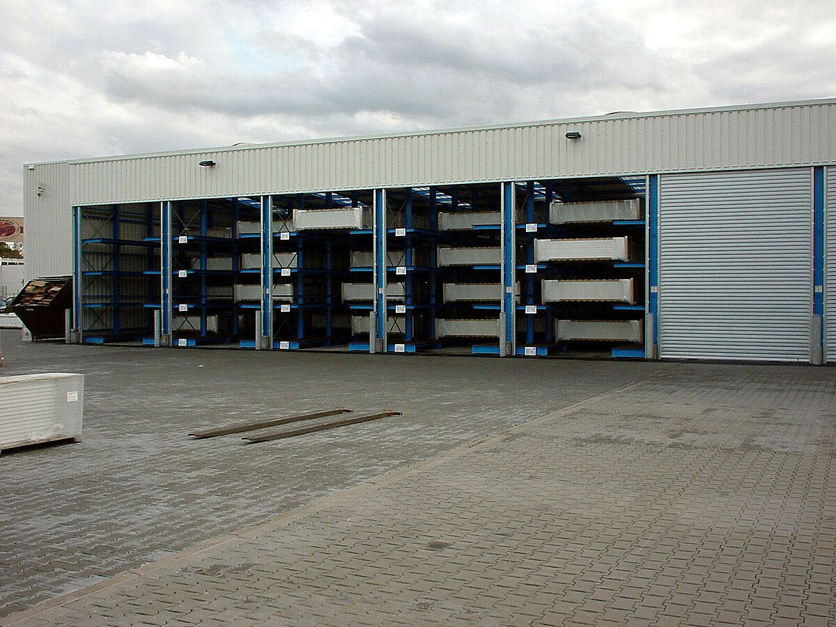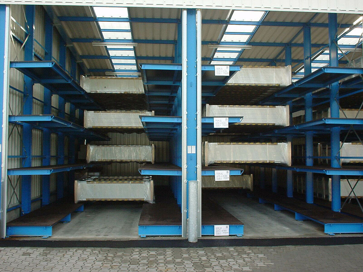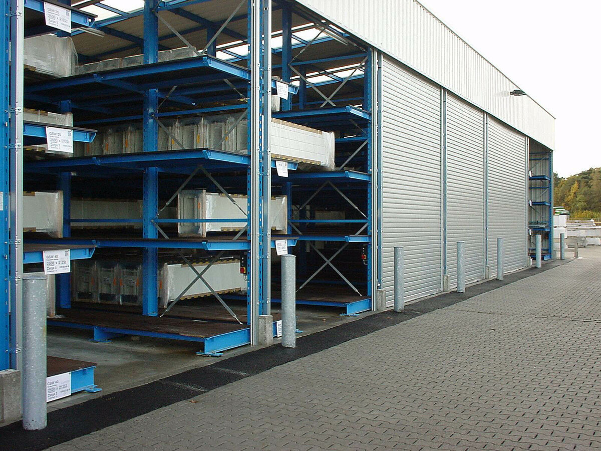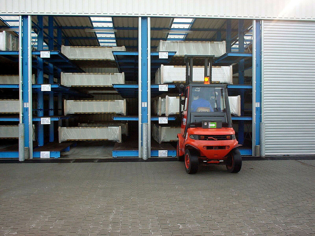 Due to an increase in sales, an extension of the warehouse for finished products was necessary, considering the special requirements of the storage of small lines. After a few planning conversations, a new type of drive-in racking system based on cantilever racks has been designed which allows to store gates with a width of 4.2 m up to 6.5 m.