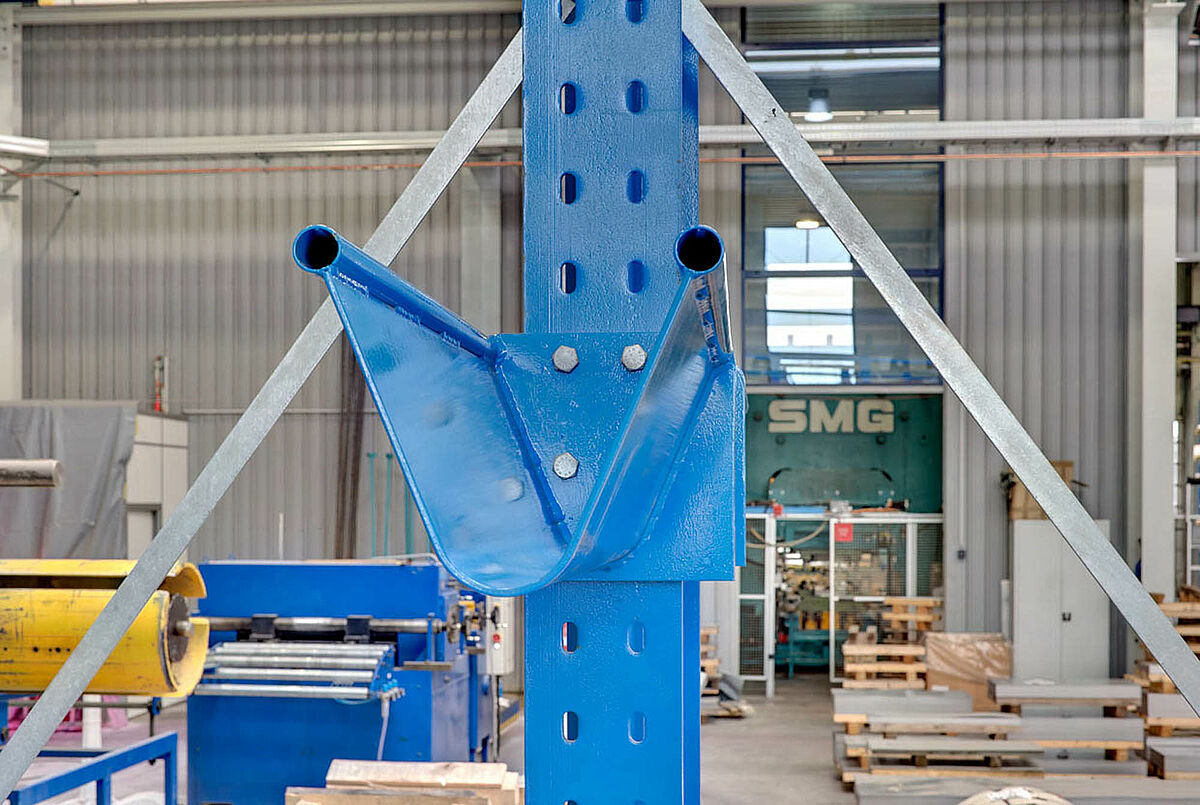 For the storage of coils THERMOWAVE decided for robust cantilever coil by OHRA. The specially developed coilarm by OHRA has a capacity of up to 15 tons per arm and is therefore particularly suitable for the storage of heavy coils. The entry and removal of the coils is provided through a telescoping C-hook. Thus, the coils are transported directly from the shelf to the cutting system. Here are then the desired plate cut to length and then further processed, for example, for applications such as a press.