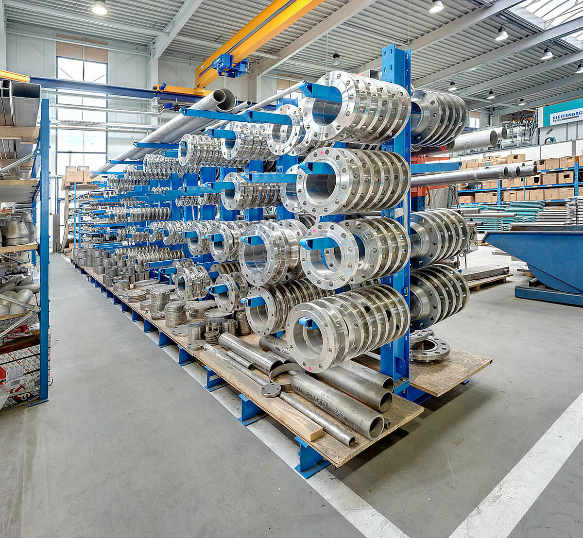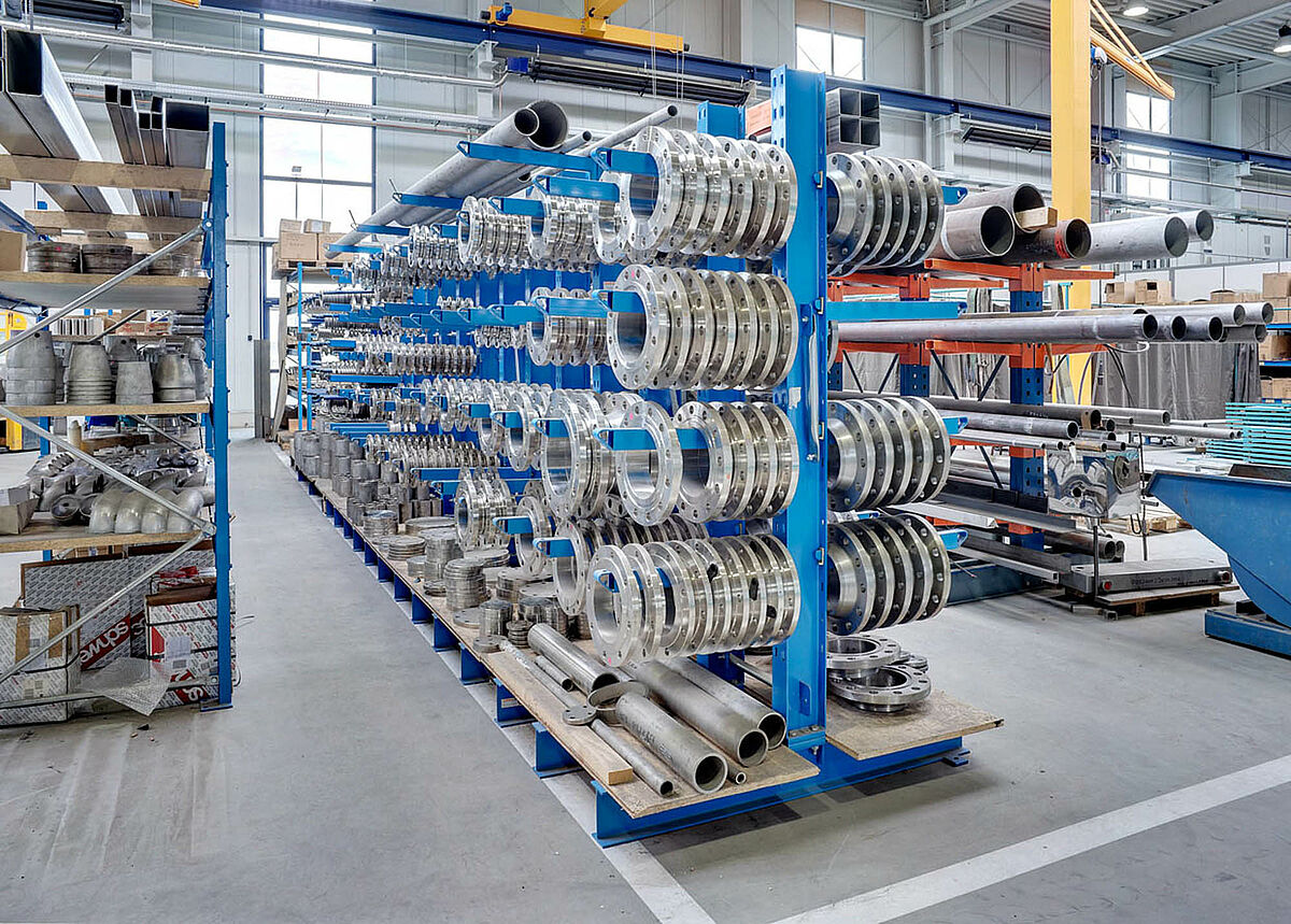 In addition to the raw materials also other parts like ex: Flanges stored in rugged cantilever racks are used. These flanges are required for connection to the finished heat exchanger. 4 Flanges are used per every plate heat exchangers. Thus, a correspondingly high number of these pieces are always available from stock.