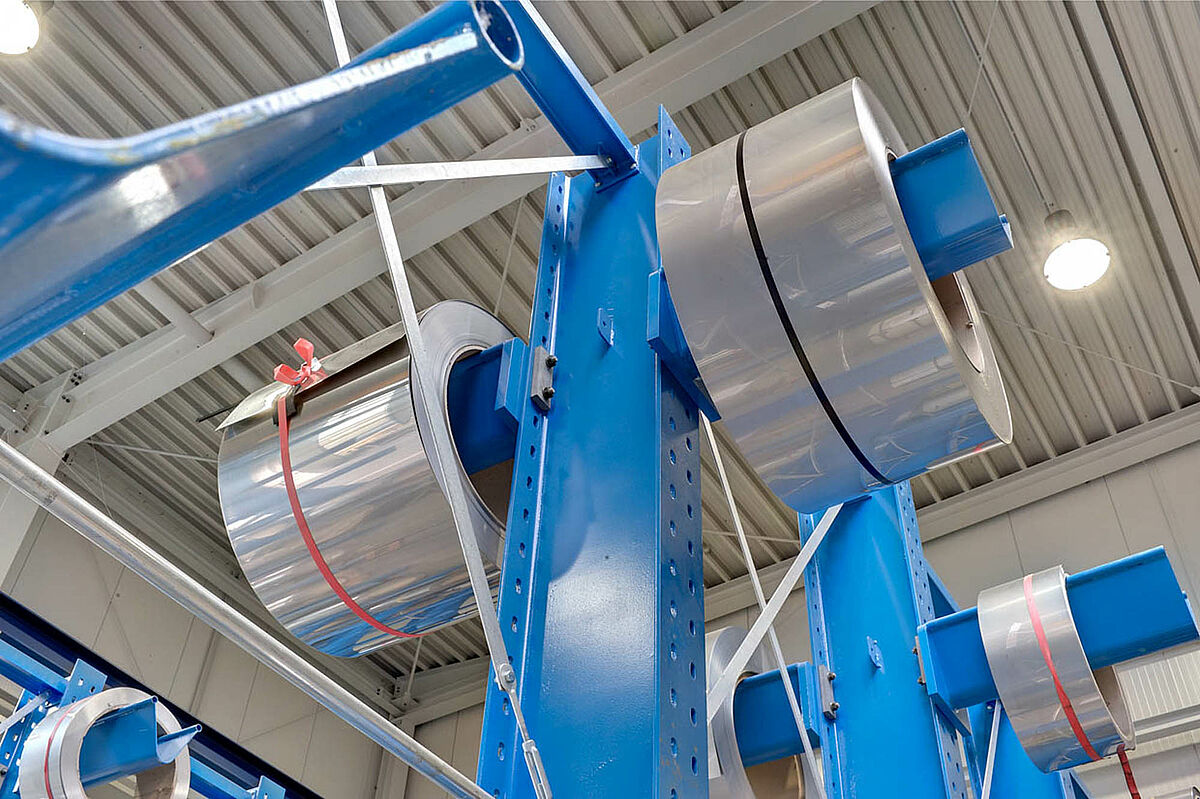 To manufacture these devices steel sheets are used, which must be supplied as coils and upstream for subsequent production. The coils have, depending on the component, various fixed widths and are therefore of different severity.
