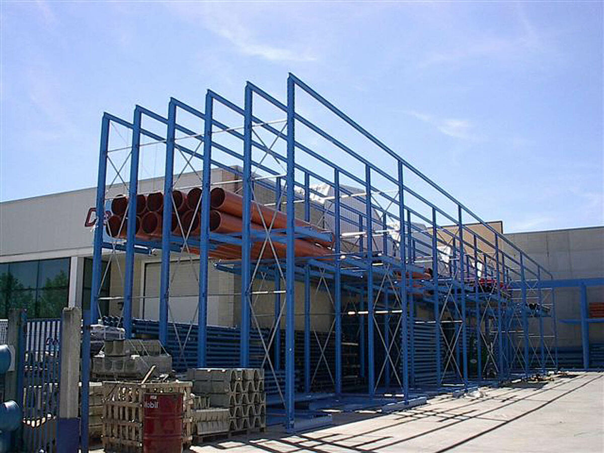 As a complement to the Drive in- OHRA also delivered and assembled robust cantilever. Here, the grades are stored, which are required less frequently. The tube bundles are stored here in several superimposed layers. Thanks to the cantilever length of up to 2,500 mm, the customer can also store 2 consecutive pipe packets on a plain area.