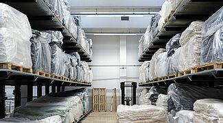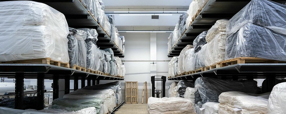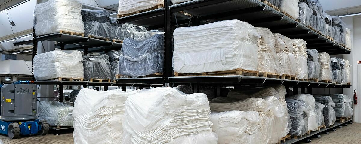Previously, trigema stored the fabrics in a floor stacking system between the “production” and “finishing” stages. But with increasing utilisation of the warehouse, accessing the individual articles proved to be too time-consuming. In addition, moving the textiles around frequently caused damage to the fabric. The company wanted to store their goods according to the first-in-first-out principle (FIFO), but this could only be implemented at great expense. As higher storage capacities became necessary, trigema took the opportunity to thoroughly optimise the logistics processes in the buffer warehouse.