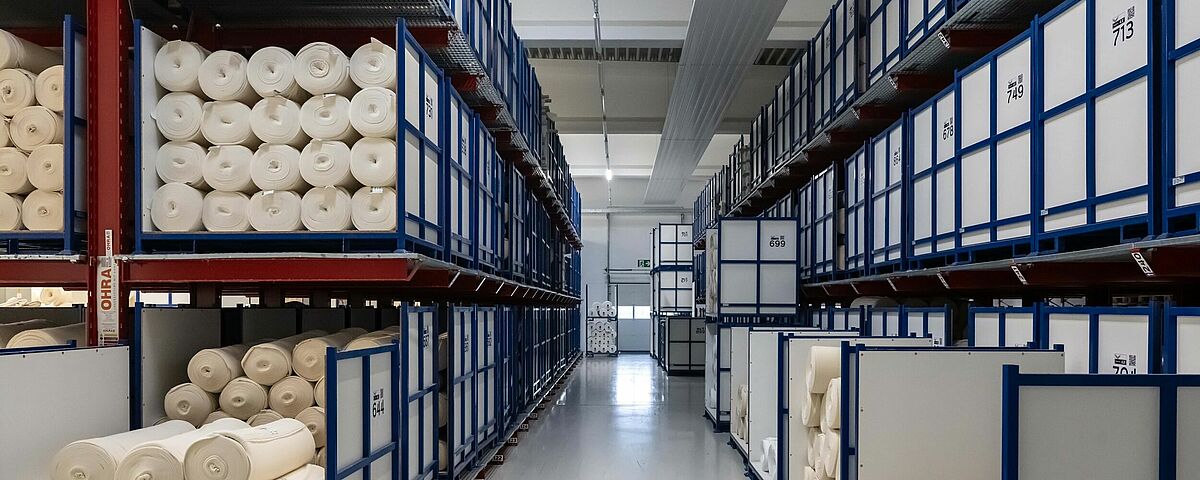 The core of the renovation was converting floor stacking to rack storage. As storage locations were necessary for fabrics in a range of types and conditions, trigema decided to equip the warehouse with both pallet racking and cantilever racking from OHRA. In order to ensure production was not disrupted, OHRA installed the racking over the course of a weekend. The pallet racking was equipped with both chipboard shelving and metal grating, and the cantilever racking also had metal grating – this created a continuous storage surface that could accommodate a wide range of storage aids (different pallet formats, boxes or fabrics without storage aids).